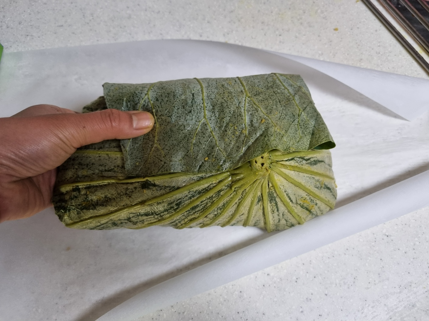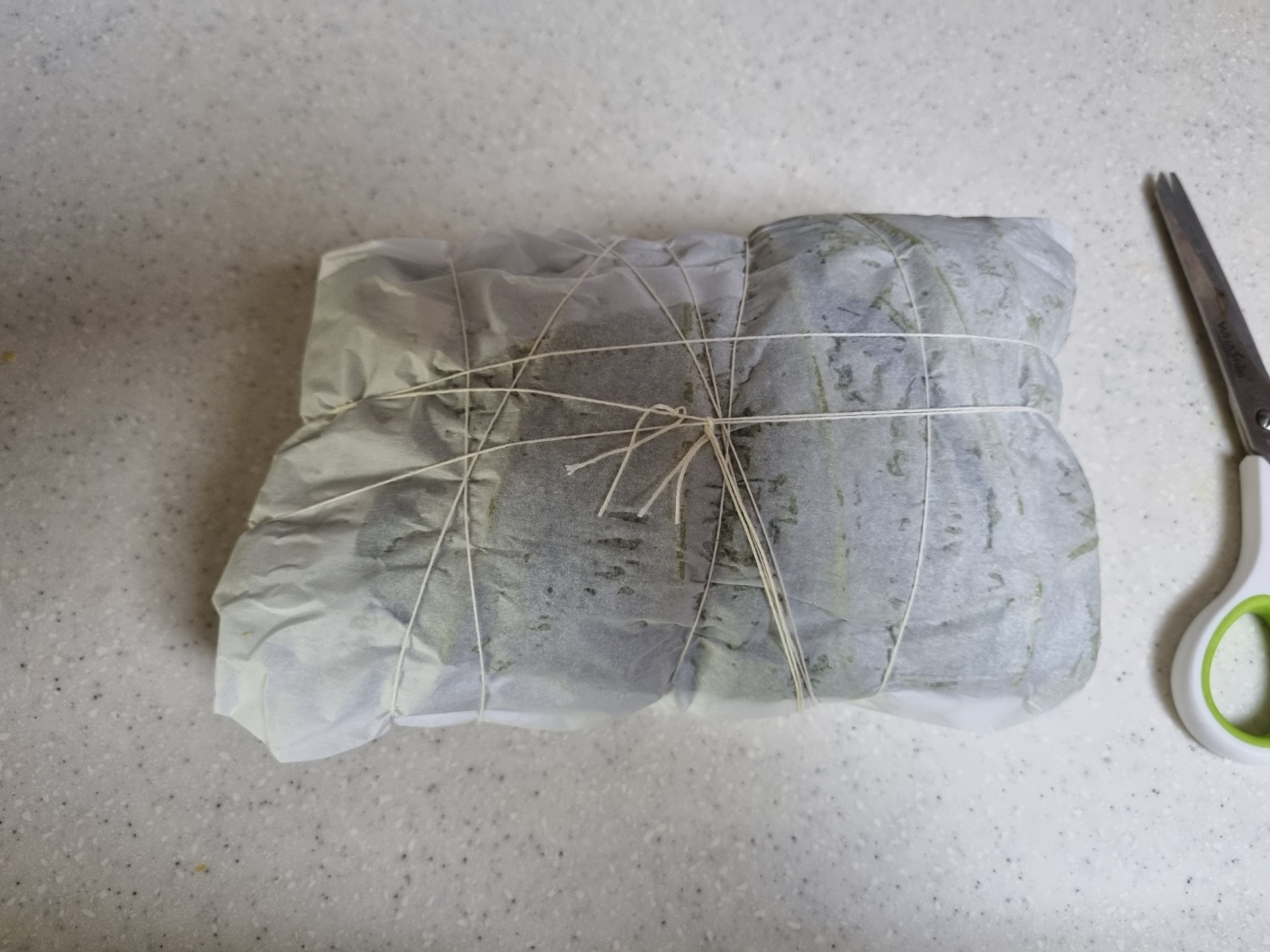 종이 호일이 풀리지 않도록 실로 묶었어요. 실은 불에 타요. 얇은 철사를 이용하는 게 좋아요. 그러나 안에 연잎이 있기 때문에 크게 개의치 않고 그냥 칠로 고정했어요.