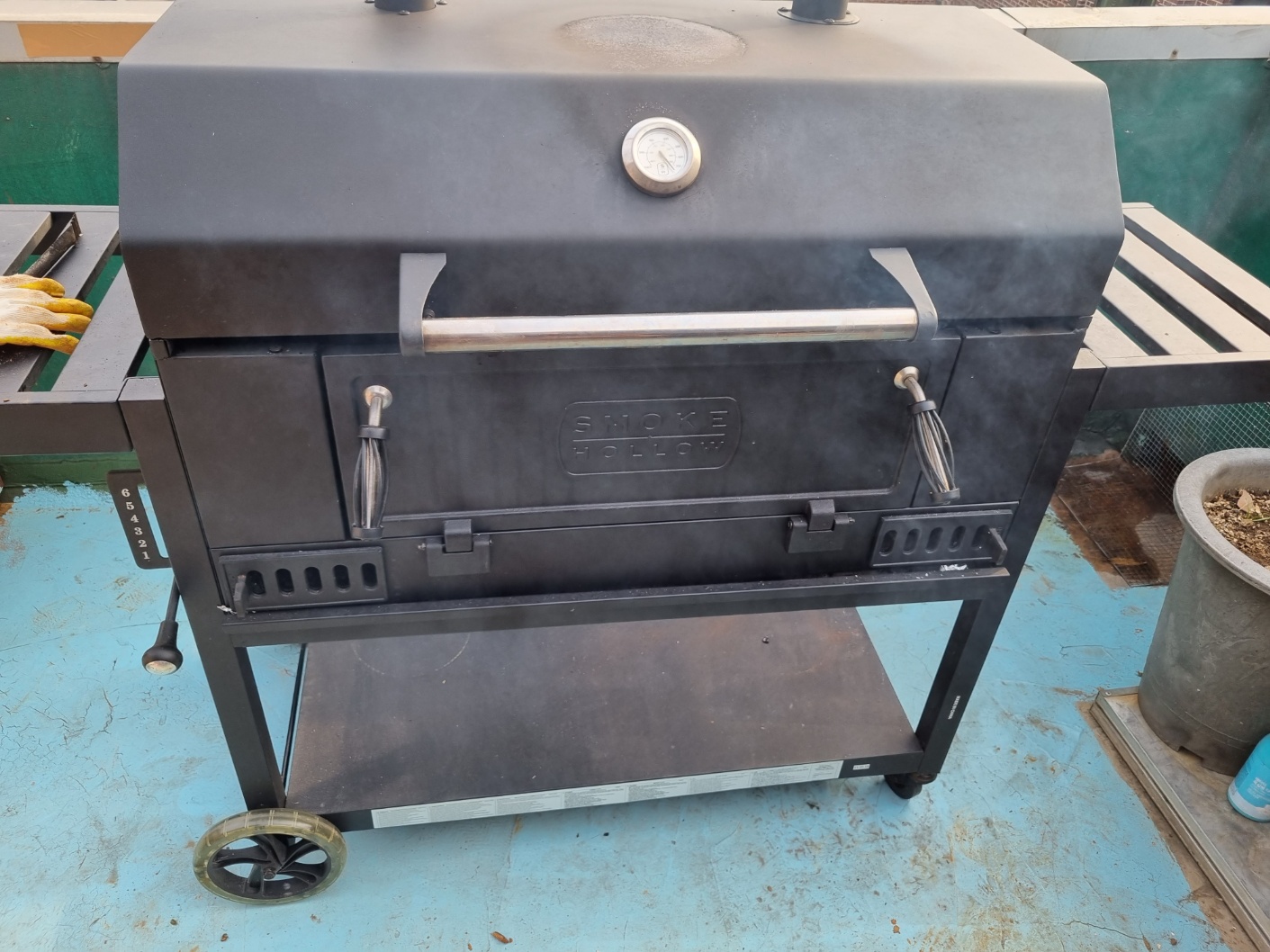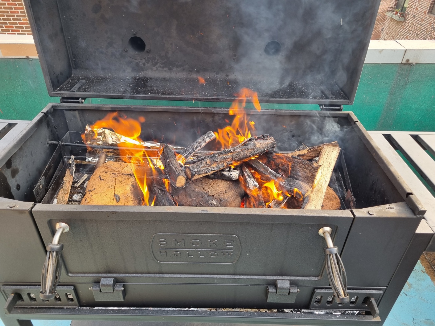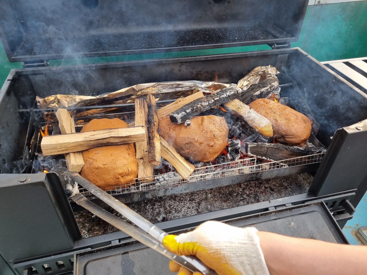 장작 2박스를 태우고 불이 꺼져갈 무렵에 뚜껑을 덮었어요. 남은 열로 닭이 골구로 잘 익기를 기도했어요. 약 1시간 정도 불을 피웠어요.