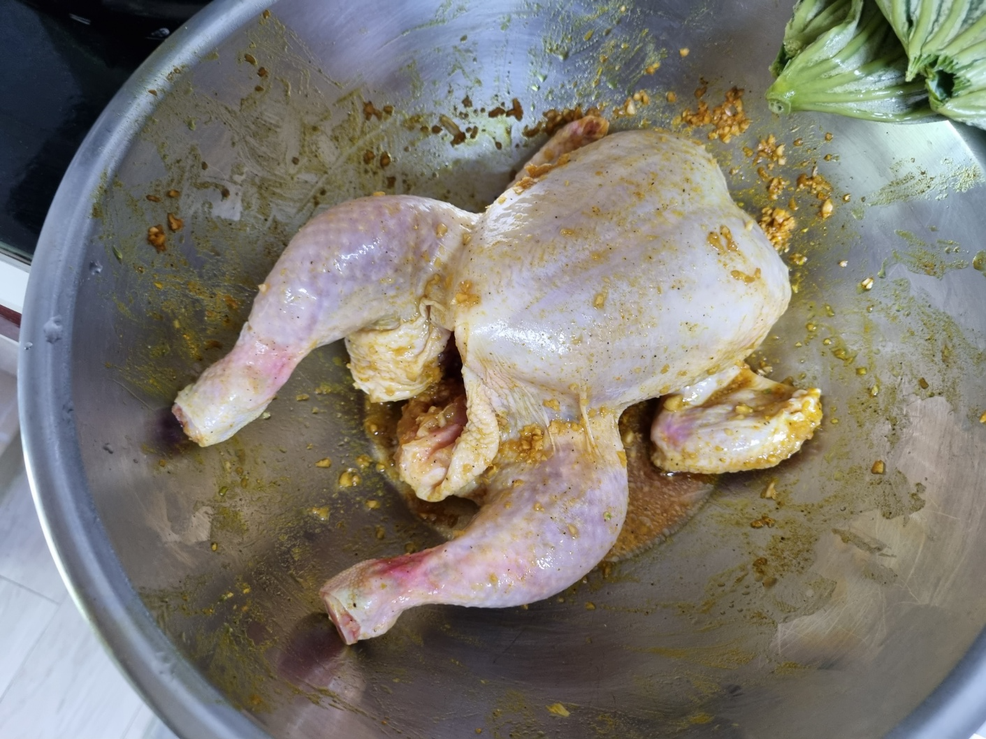 생닭에 밑간을 했어요. 소금, 후추, 간장, 마늘, 생강, 강황 가루를 넣었어요. 그리고 1시간 정도 재워 뒀어요. 닭은 11호 닭으로 했지만 생각보다 닭이 컸어요. 9호 닭이 적당할 것 같아요. 필자가 마트에 갔을 때 9호 닭이 없어서 11호를 샀더니 너무 큰 느낌이었어요.