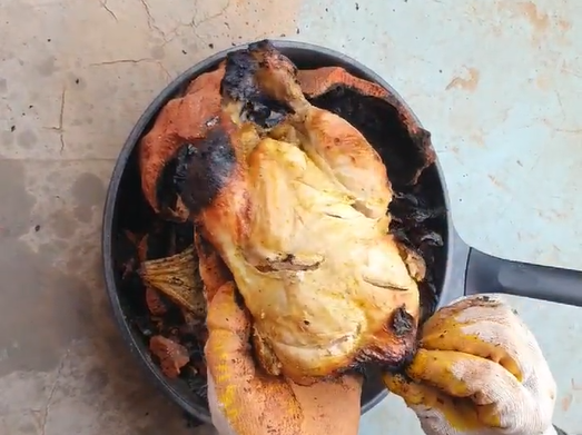 장작불을 피우고 거지닭을 불 속으로 투척했어요.