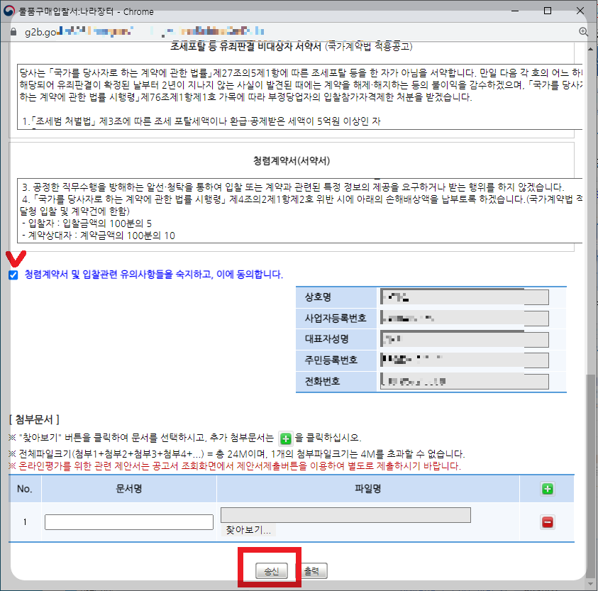 화면의 하단으로 가면 '청렴계약서 및 입찰관련 유의사항들을 숙지하고, 이에 동의합니다.'에 체크해요. 그리고 송신 버튼을 눌러요.