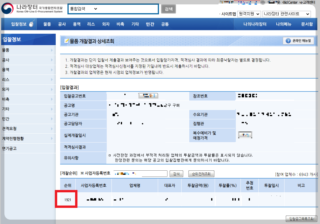 필자는 1921순위예요. 낙찰하한선미달 업체를 포함하면 해당 공고에 입찰에 참가한 업체가 5천 개가 넘어요. ㅠㅠ
