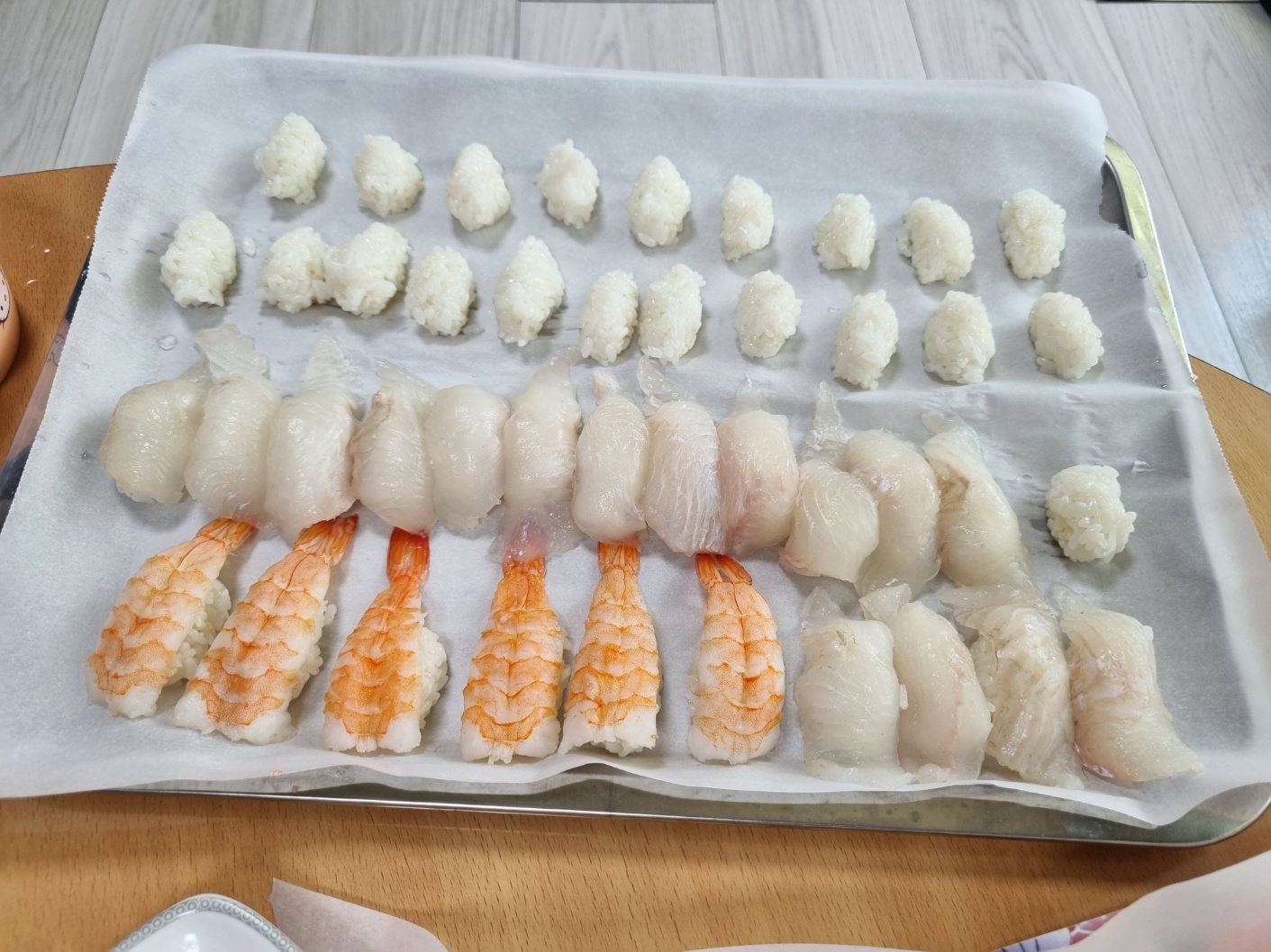 광어회만 올려주면 광어 초밥이 만들어져요. 위의 사진은 광어초밥과 연어초밥이 섞여있어요. 그리고 밥알만 있는 것들이 보여요. 밥알만 있는 것들은 셀프 초밥을 위한 밥알이에요.