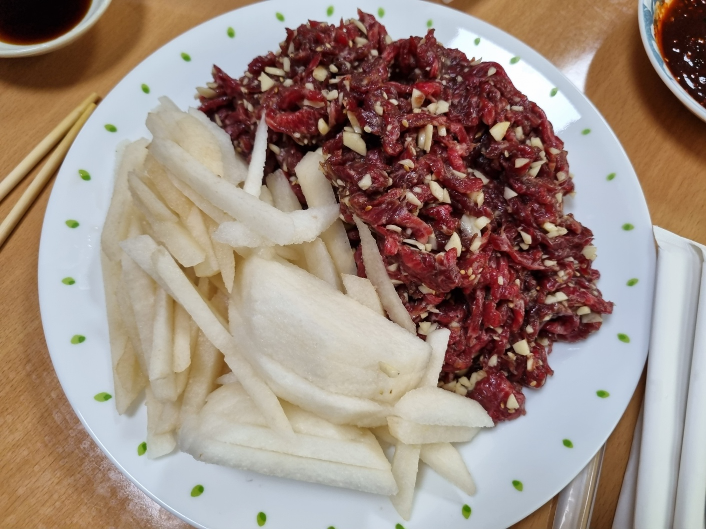 육회도 만들었어요. 저 잠깐만 웃을께욬ㅋㅋㅋㅋㅋㅋㅋㅋㅋㅋㅋㅋㅋㅋㅋㅋㅋㅋㅋㅋㅋㅋㅋㅋㅋㅋㅋㅋㅋㅋㅋㅋㅋㅋㅋㅋㅋㅋㅋㅋㅋㅋ 글을 쓰다 보니깐 너무 웃기네요. 고기가 무려 2근이에요. 도대체 뭘 얼마나 먹은 거지?!!! 이거 사람이 먹은 거 맞나 싶을 정도로 많이 먹었네요.