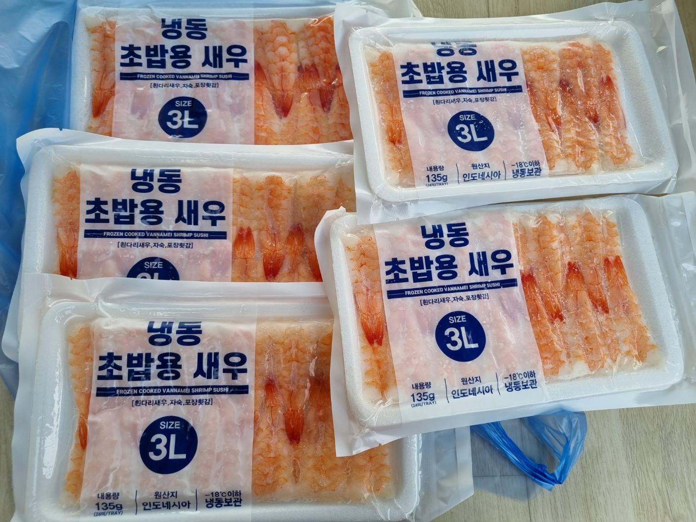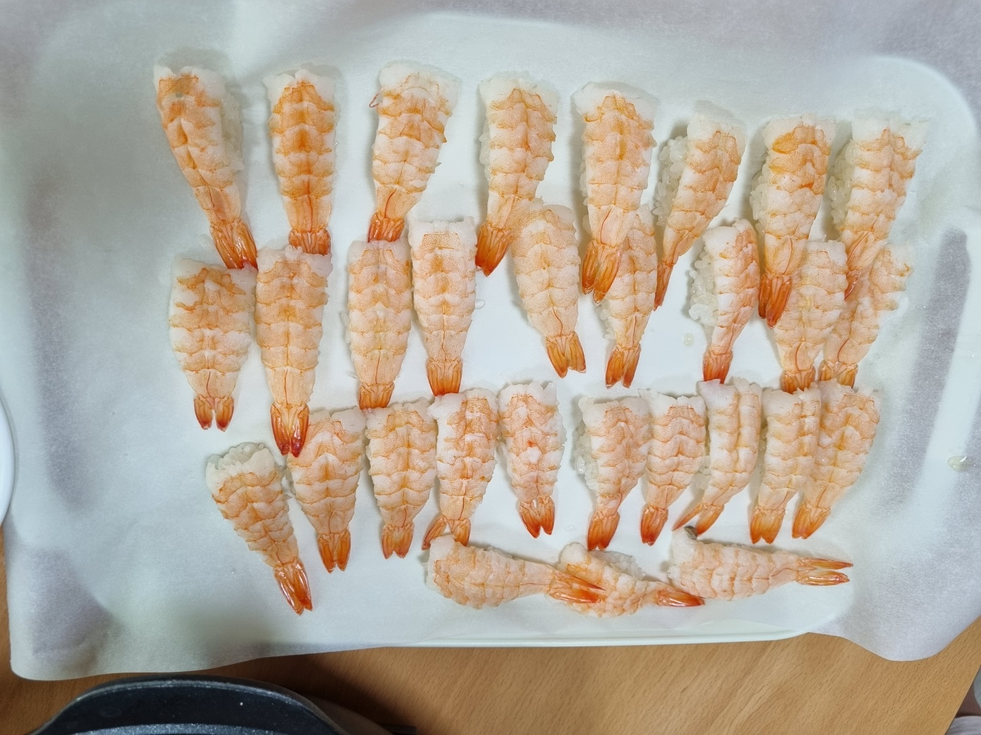 식자재 마트에 가면 냉동 초밥용 새우를 팔아요. 필자는 그 중 가장 큰 사이즈의 초새우를 샀어요. 상온에 해동시켜요. 해동된 초밥용 새우는 그대로 사용해요. 키친 타월로 물기를 제거하거나 채반에 걸쳐 물기를 빼지 않아도 돼요. 필자는 처음에 초밥을 만들 때 키친타월로 물기하나 남기지 않고 모두 제거했었어요. 그러니깐 새우가 매우 푸석해졌어요. 그래서 매우 맛없게 먹었던 기억이 나요. 이번이 3번째 만드는 초새우 초밥이에요. 이젠 초밥을 만드는데 도가 텄어요. 씻지도 닦지도 말고 해동된 새우 그대로 사용해야 맛있어요.