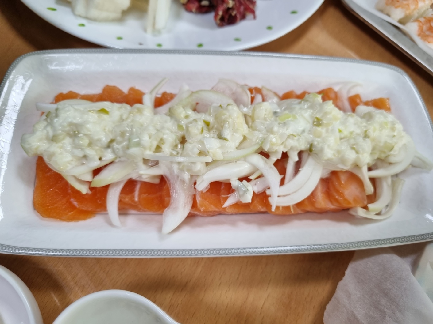 위의 사진은 연어예요. 냉동 연어. 요즘은 마트에 가면 어디서든 살 수 있는 것 같아요. 슬라이스 연어에 채 썬 양파를 올리고 타르타르소스를 뿌려요. 보기만 해도 군침이 돌아요.