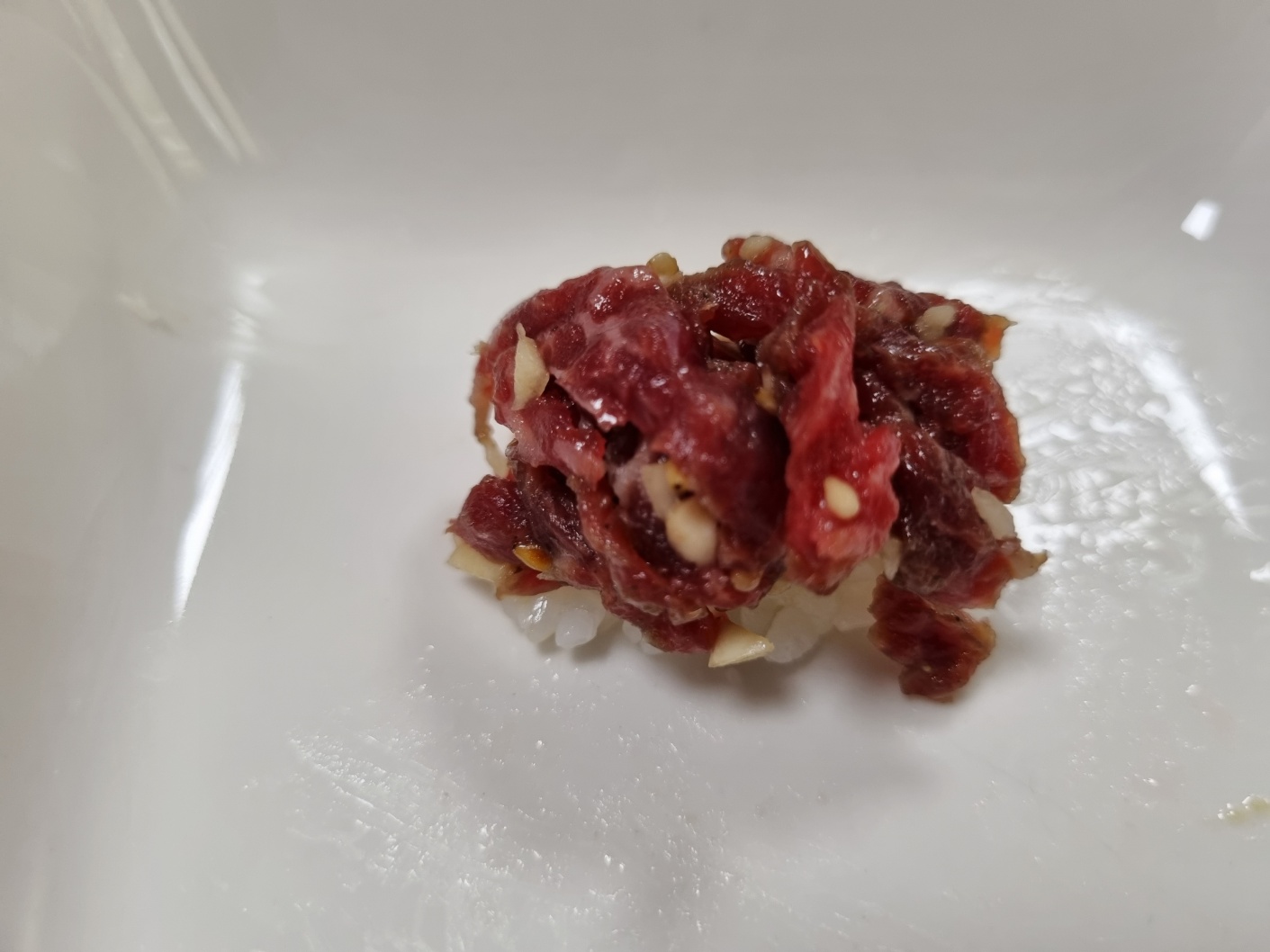 초밥 양념이 된 밥알에 육회 올리면 육회 초밥이 돼요. 맛있어요. 쇠고기 타다끼 초밥도 만들고 싶었는데 시어머니가 육사시미를 사오지 않으셨어요. 사람이 무슨 날고기를 그렇게 쳐먹냐며... 작작 먹으.......