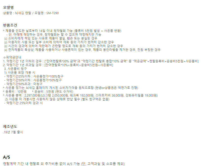 렌탈기간 만료 전 해지 및 변경의 경우 위약금 발생할 수 있어요. 위의 사진 출처는 롯데홈쇼핑이에요. 위약금이나 사은품비 청구는 홈쇼핑과 크게 다르지 않을 것이라 생각해요. 그리고 필자는 어차피 한번 시작하면 끝까지 물고 늘어지는 성격이라 해약하는 경우가 드물어서 크게 신경쓰지 않아요.