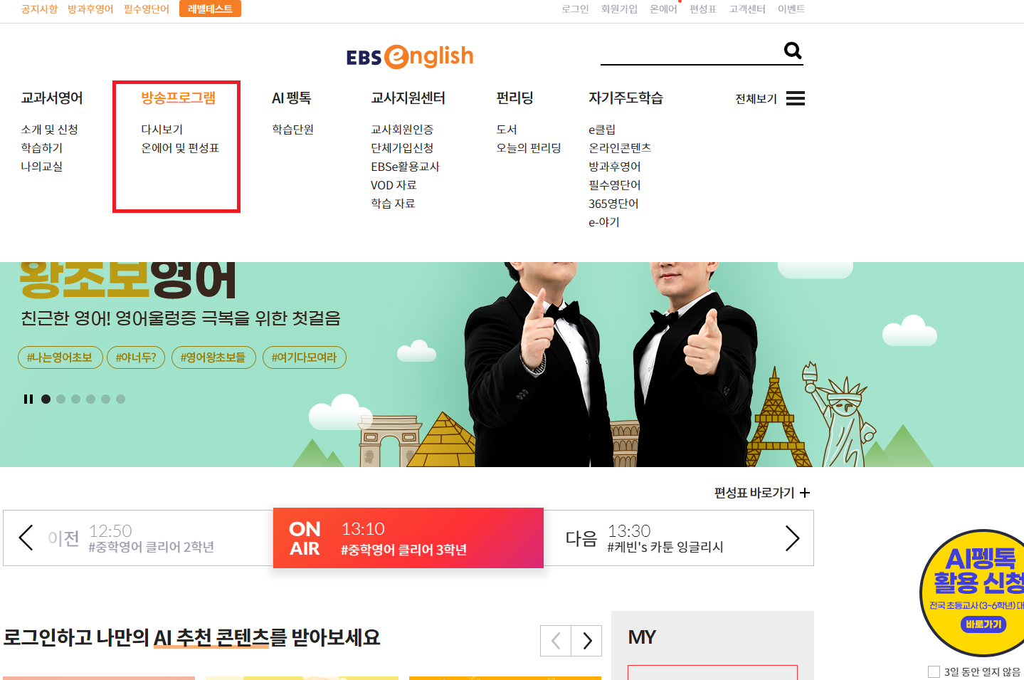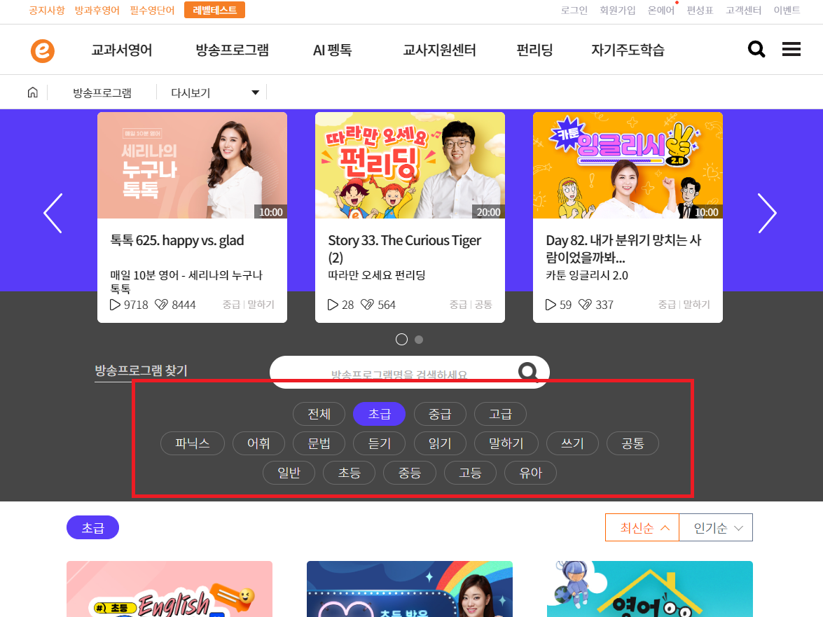 EBS English 홈페이지에 들어가면 방송 다시보기를 할 수 있어요. 초급, 중급, 고급, 초등, 중등, 고등, 읽기, 말하기, 쓰기 등등 원하는 프로그램을 찾아서 볼 수 있어요. 로그인도 안해도 돼요. EBS 잉글리쉬의 단점은 예쁜 선생님은 많은데 잘생긴 선생님은 아아ㅏ이ㅣ니다.