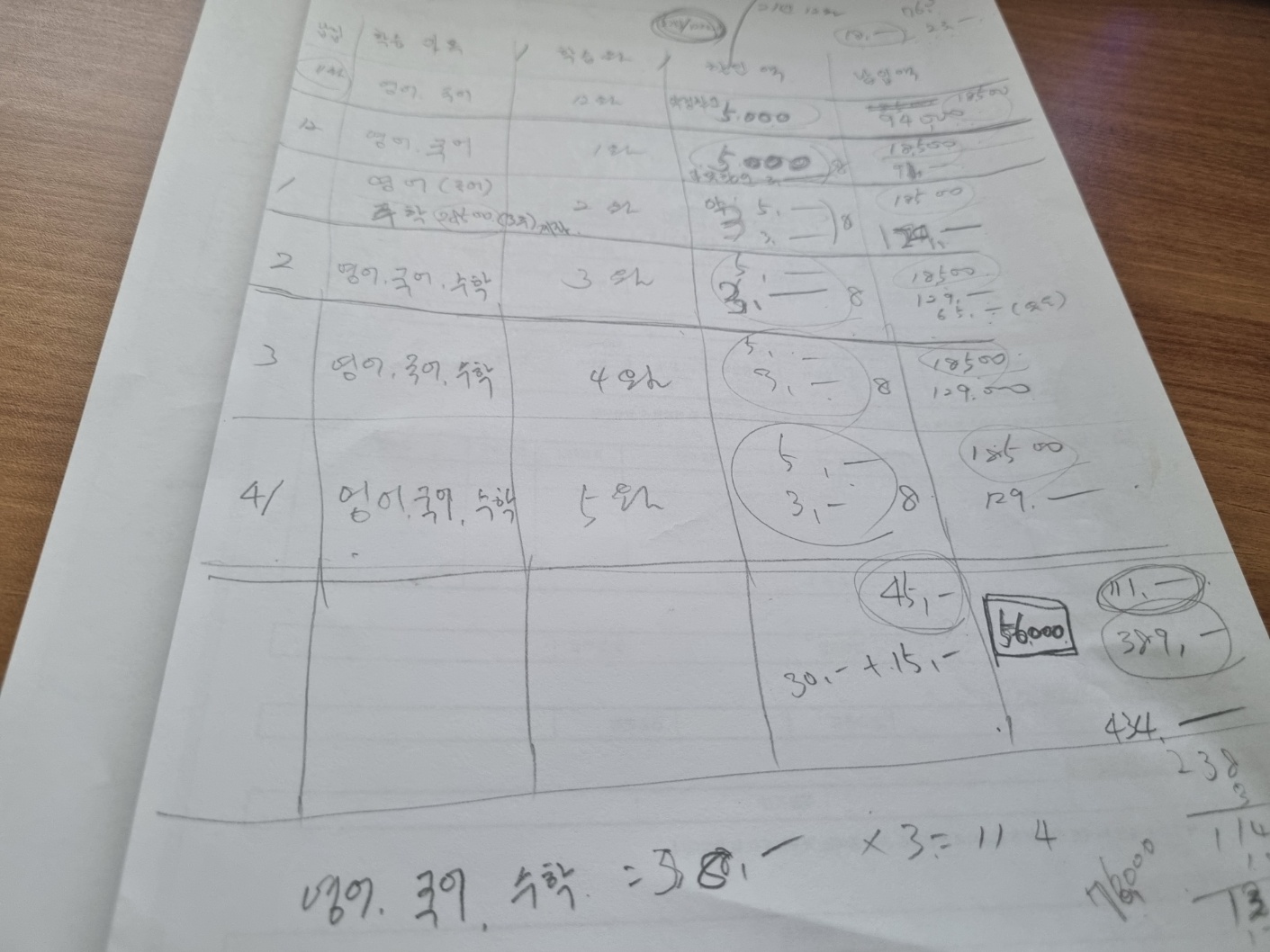 위 사진은 구몬 학습지 과목당 가격이에요.