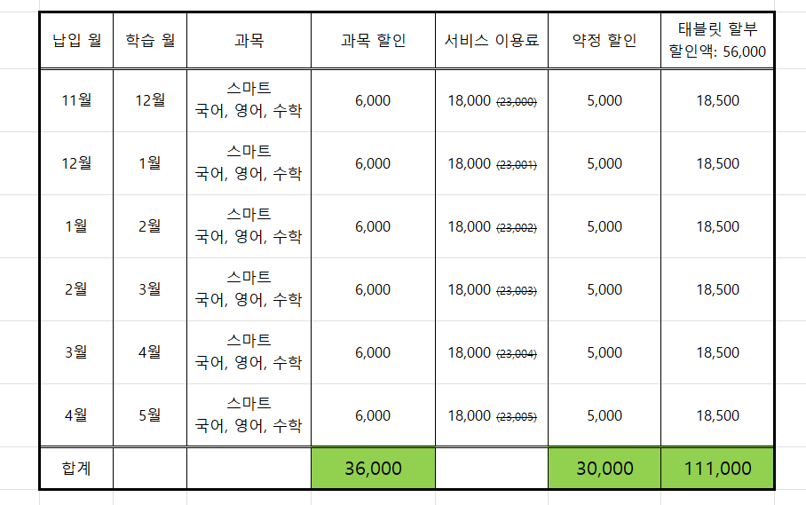 과목할인 누적 금액: 6,000 x 6개월 = 36,000원