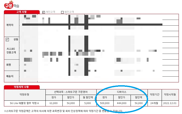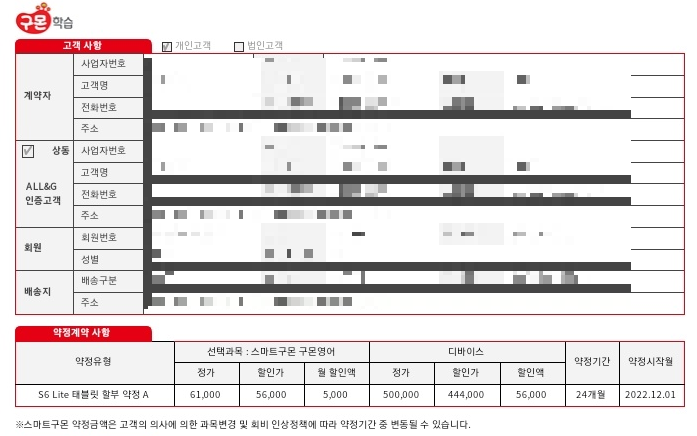 위 사진은 필자의 스마트 구몬 계약서예요. 태블릿으로 하는 스마트 구몬 영어 1과목이에요. 디바이스는 태블릿이에요. 안타깝게도 약정기간이 24개월 들어가 있어요.
