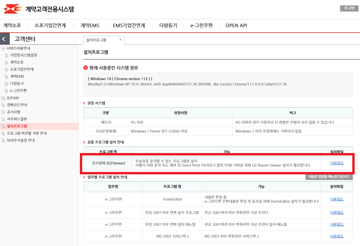 인터넷 우체국 홈페이지(https://biz.epost.go.kr/ui/index.jsp) 상단 메뉴에서 계약고객전용 -> 설치프로그램안내-> 오즈뷰어 다운로드를 클릭해요. 지정한 경로에 오즈뷰어를 다운로드해요. 그러면 압축파일이 생겨요.