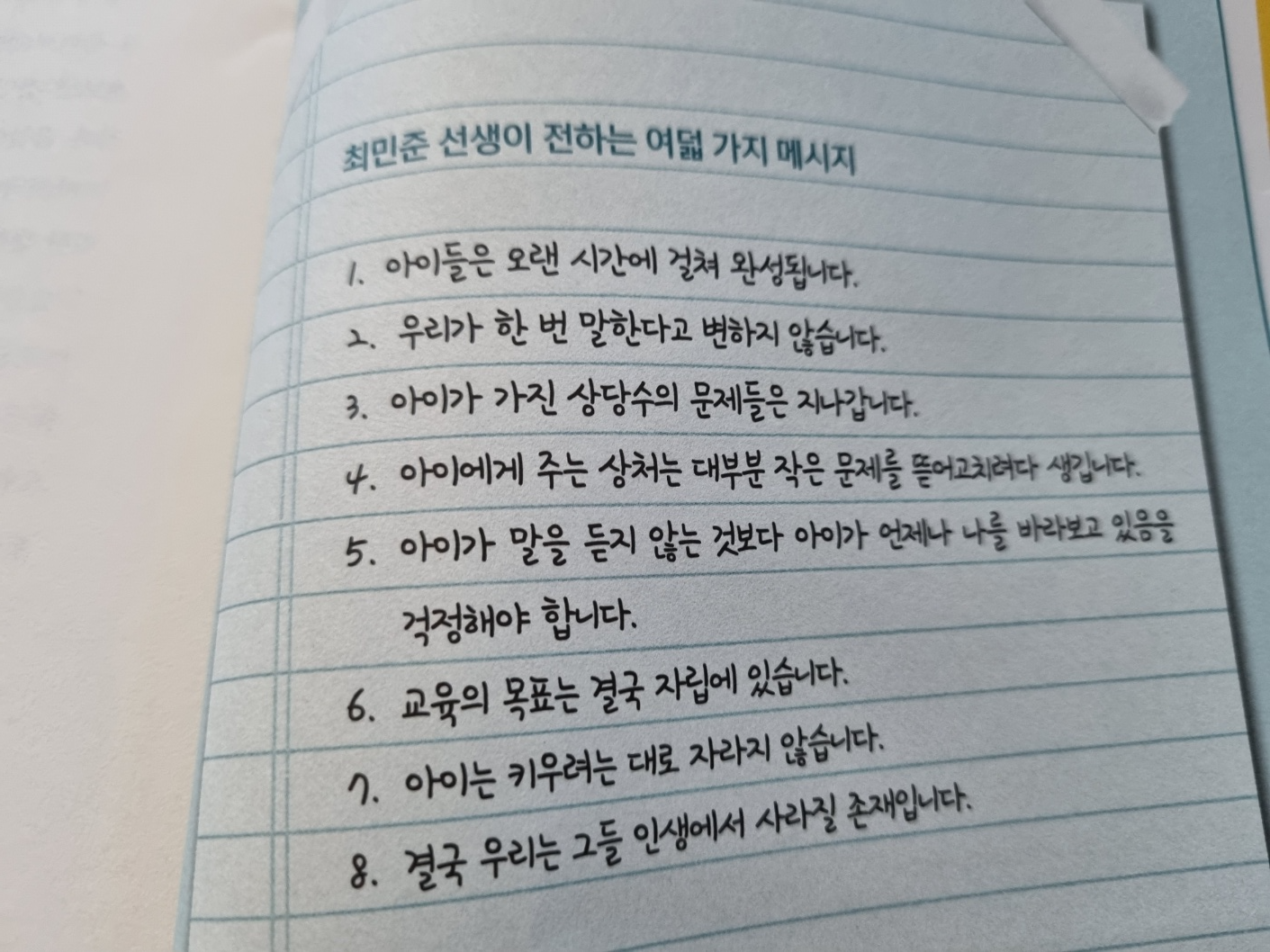 책의 마지막 페이지에 최민준 선생님이 전하는 여덟 가지 메시지가 나와요. 물론 필자는 아직 책을 다 읽지는 못했어요. 하지만 마지막 페이지는 미리 봤어요. 이 글이 필자를 너그럽고 자상하게 만드는 것 같아요. '네 잘못 아니야. 괜찮아'라고 위로받는 것 같아요.