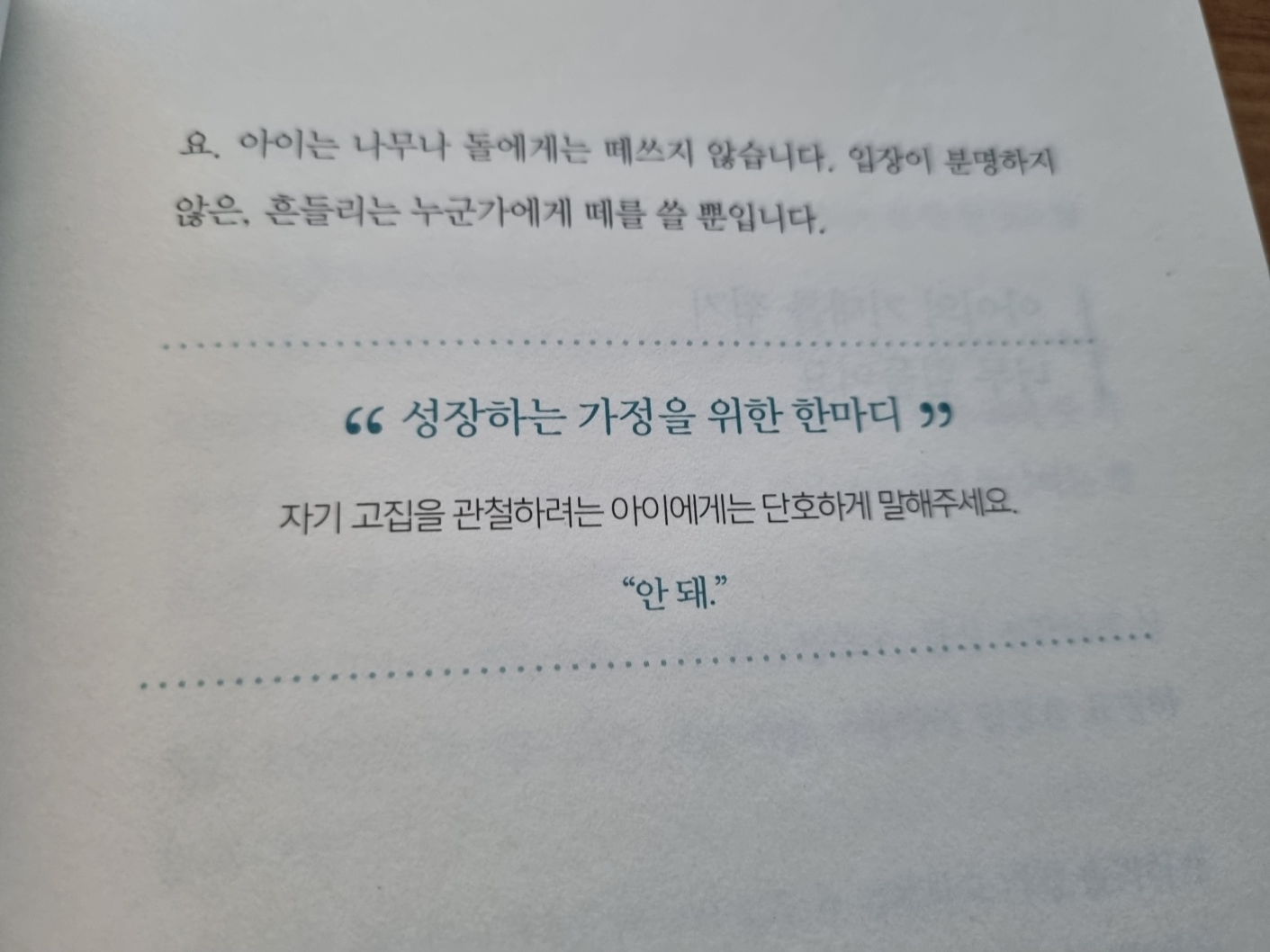 위의 사진은 1장 통제 부분에서 나오는 글이에요. 놀라움을 금치 못했어요. 아이에게 '안돼', '하지 마', '할 수 없어'라는 부정적 단어를 사용하기보다 긍정적인 표현으로 하라고 어디서 들었어요. 하지만 애써 긍정적으로 돌려 말하는 엄마의 말이 아이는 더 혼란스러움을 느꼈을 것 같아요. 안 되는 건 "안 돼"라고 말하는 단호함이 필요한 것 같아요.
