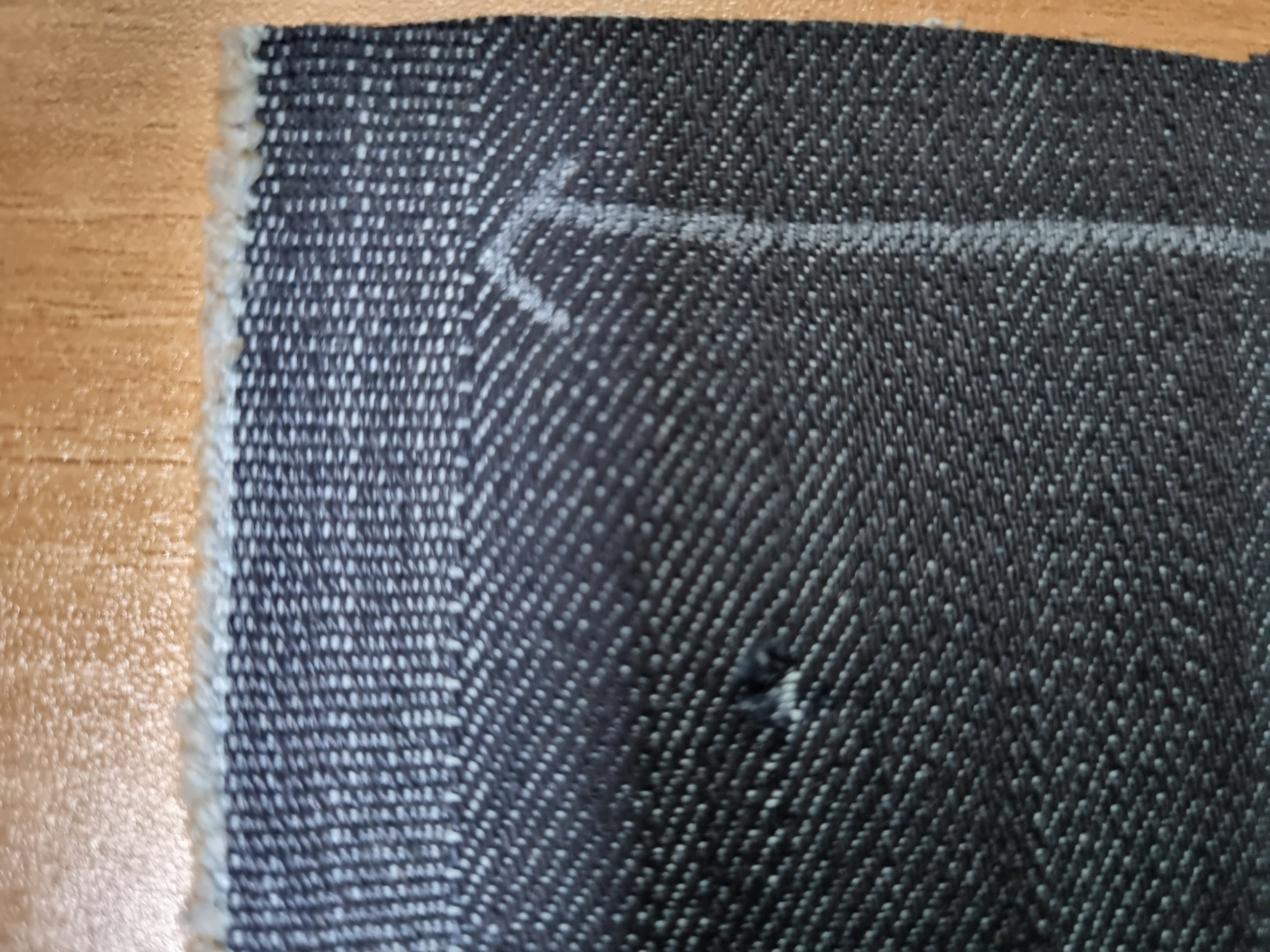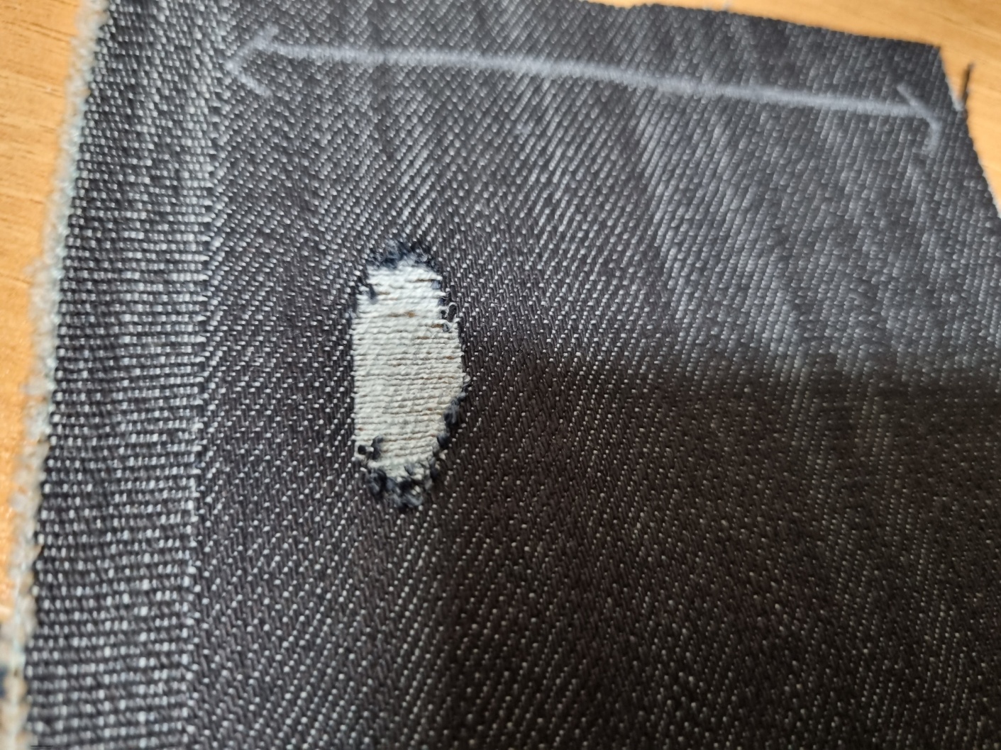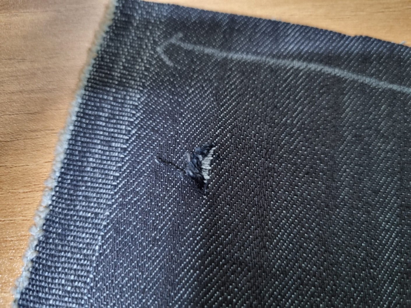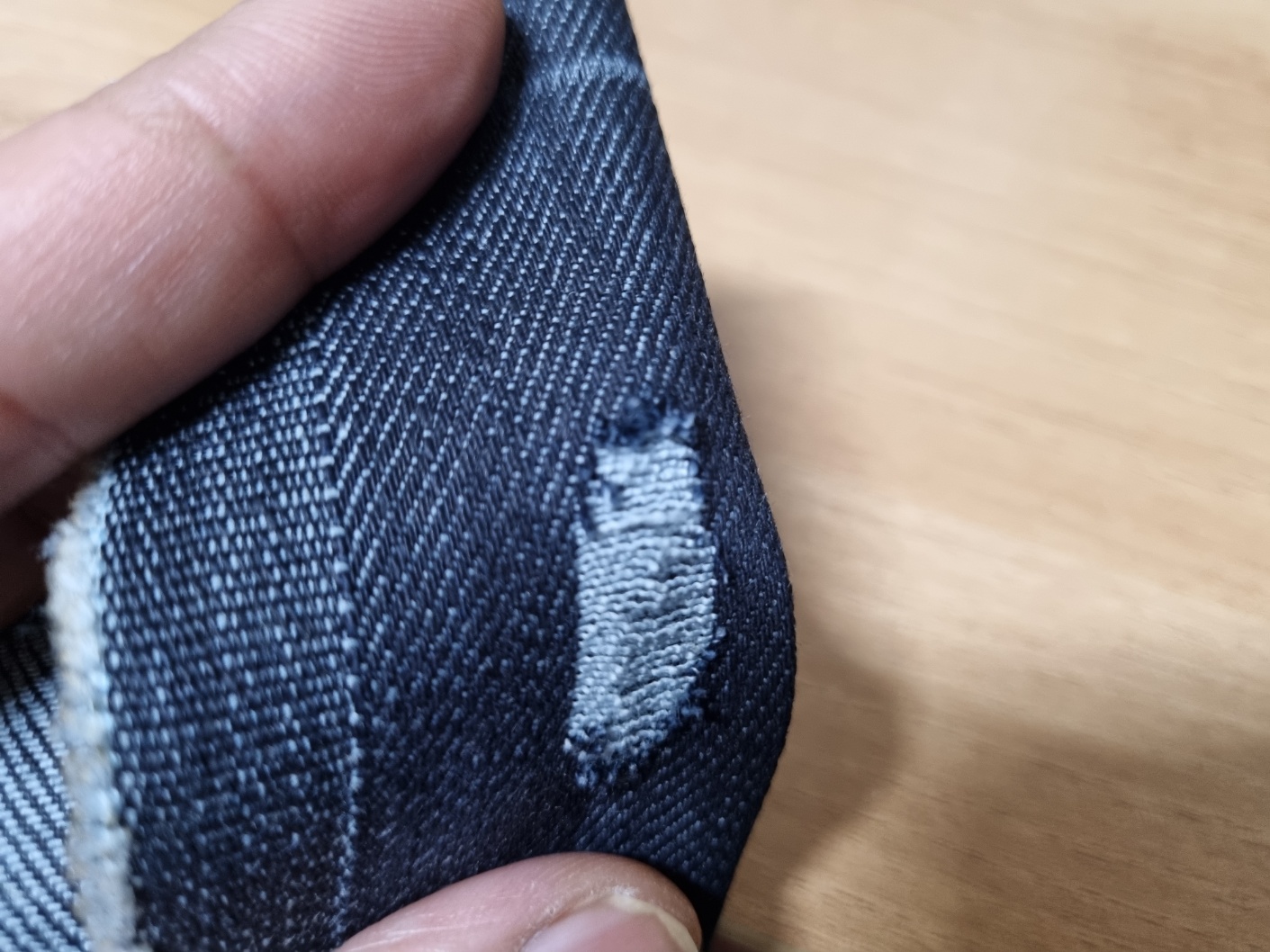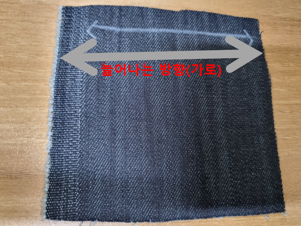 위의 데님 원단은 늘어나는 방향의 가로 실은 흰색이에요. 세로 실은 청색이에요. 필자는 흰색(가로 실)을 남기고 청색(세로 실)을 뜯으려고 해요. 필자가 좋아하는 총알 스크래치 데님 청바지도 가로 실이 남아 있어서 따라 하는 거예요.