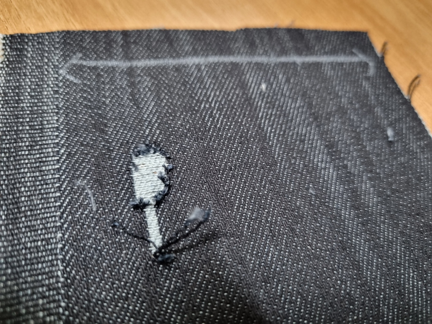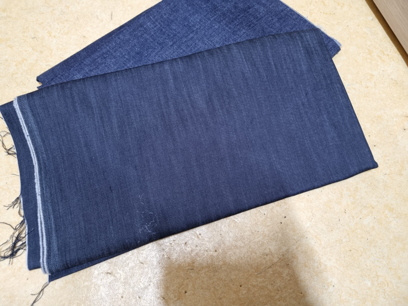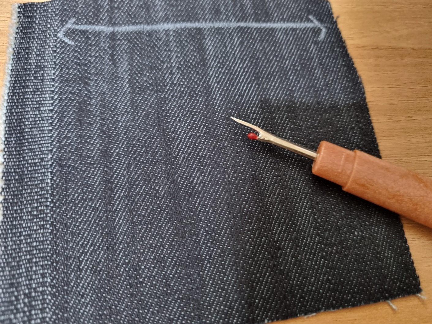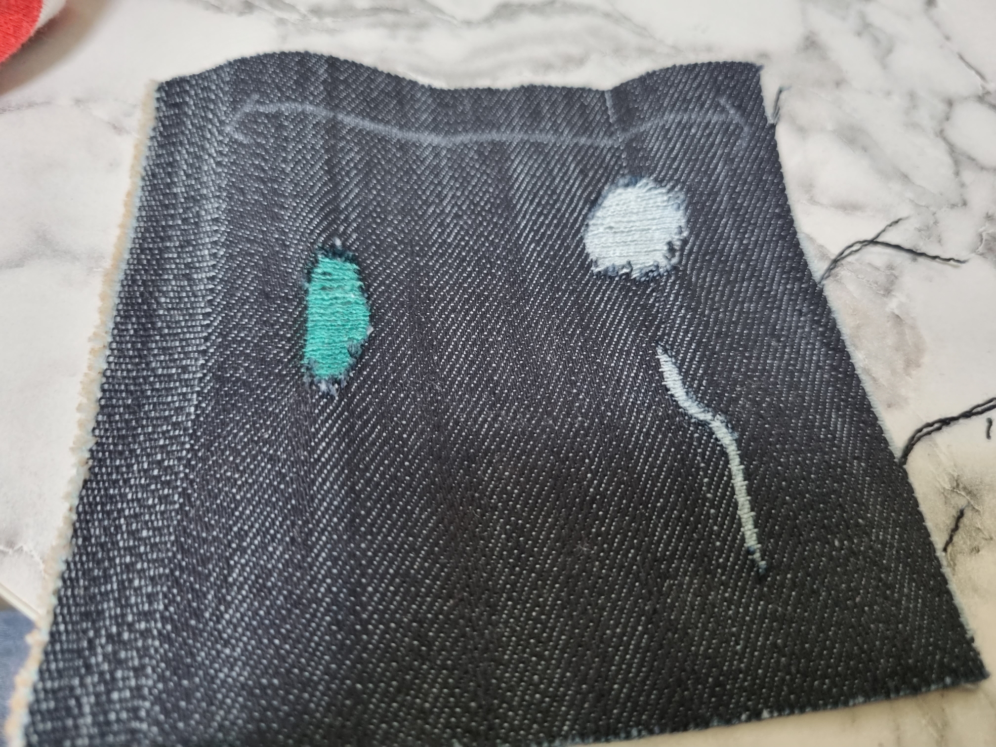 위의 데님 원단은 늘어나는 방향의 가로 실은 흰색이에요. 세로 실은 청색이에요. 필자는 흰색(가로 실)을 남기고 청색(세로 실)을 뜯으려고 해요. 필자가 좋아하는 총알 스크래치 데님 청바지도 가로 실이 남아 있어서 따라 하는 거예요.