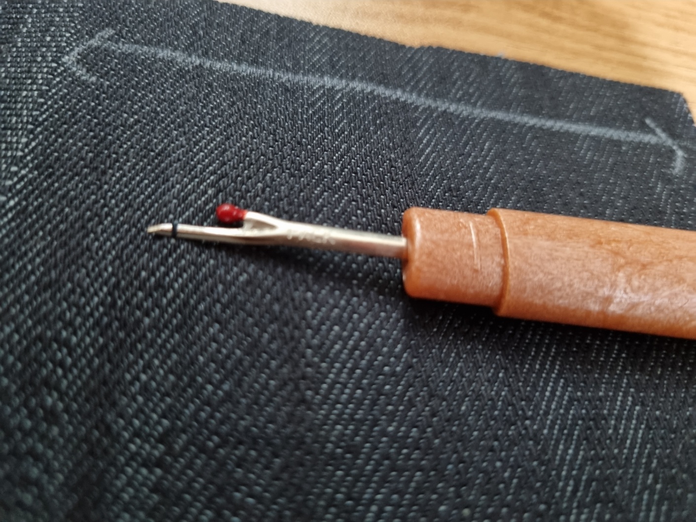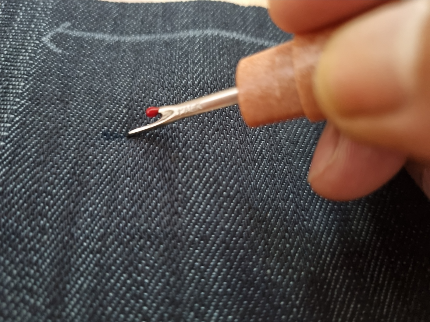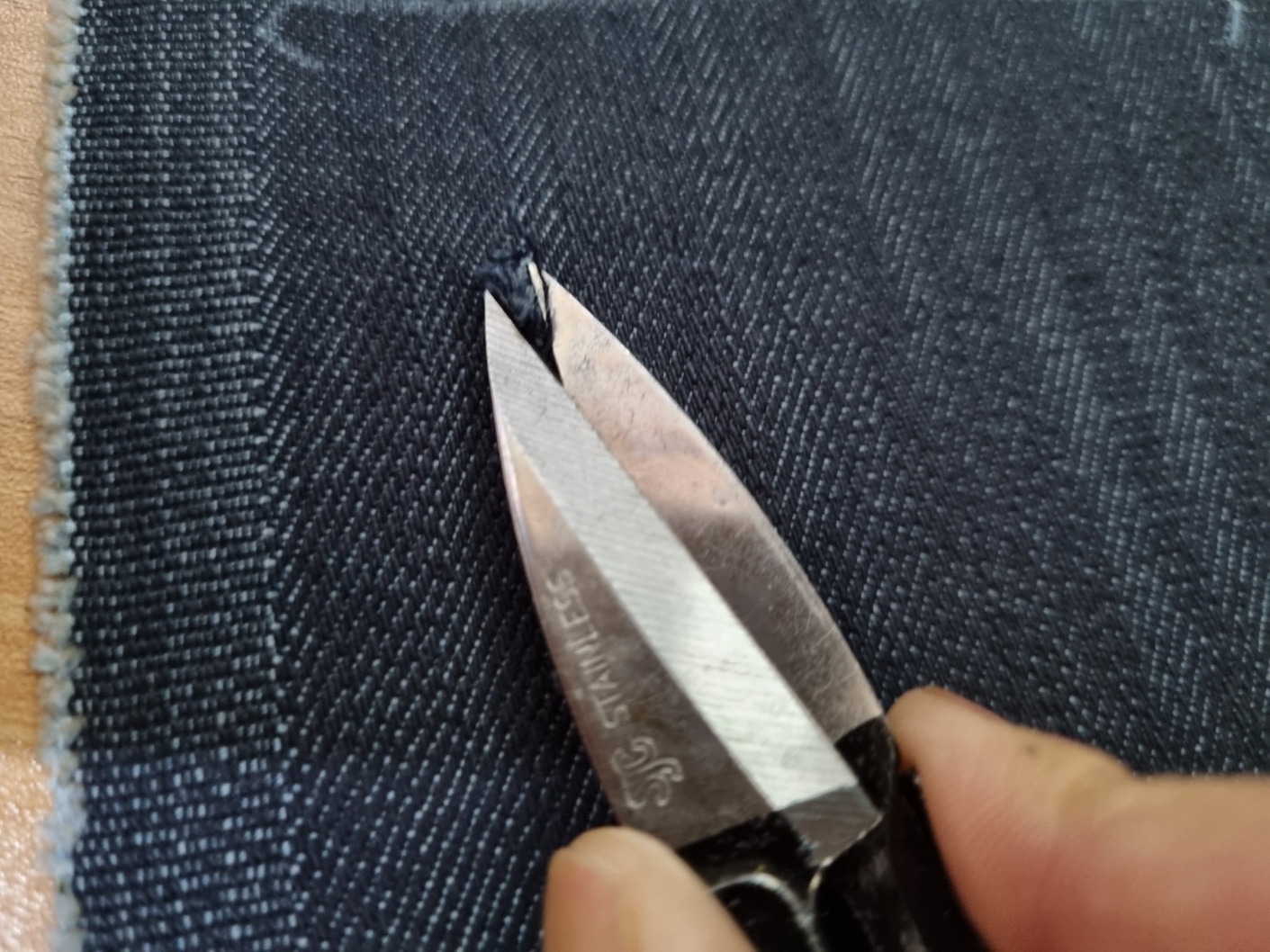 먼저 뜯게의 뾰족한 부분을 이용해 청지 원단을 긁어요. 그러면 실이 느슨해진 부분이 보여요.