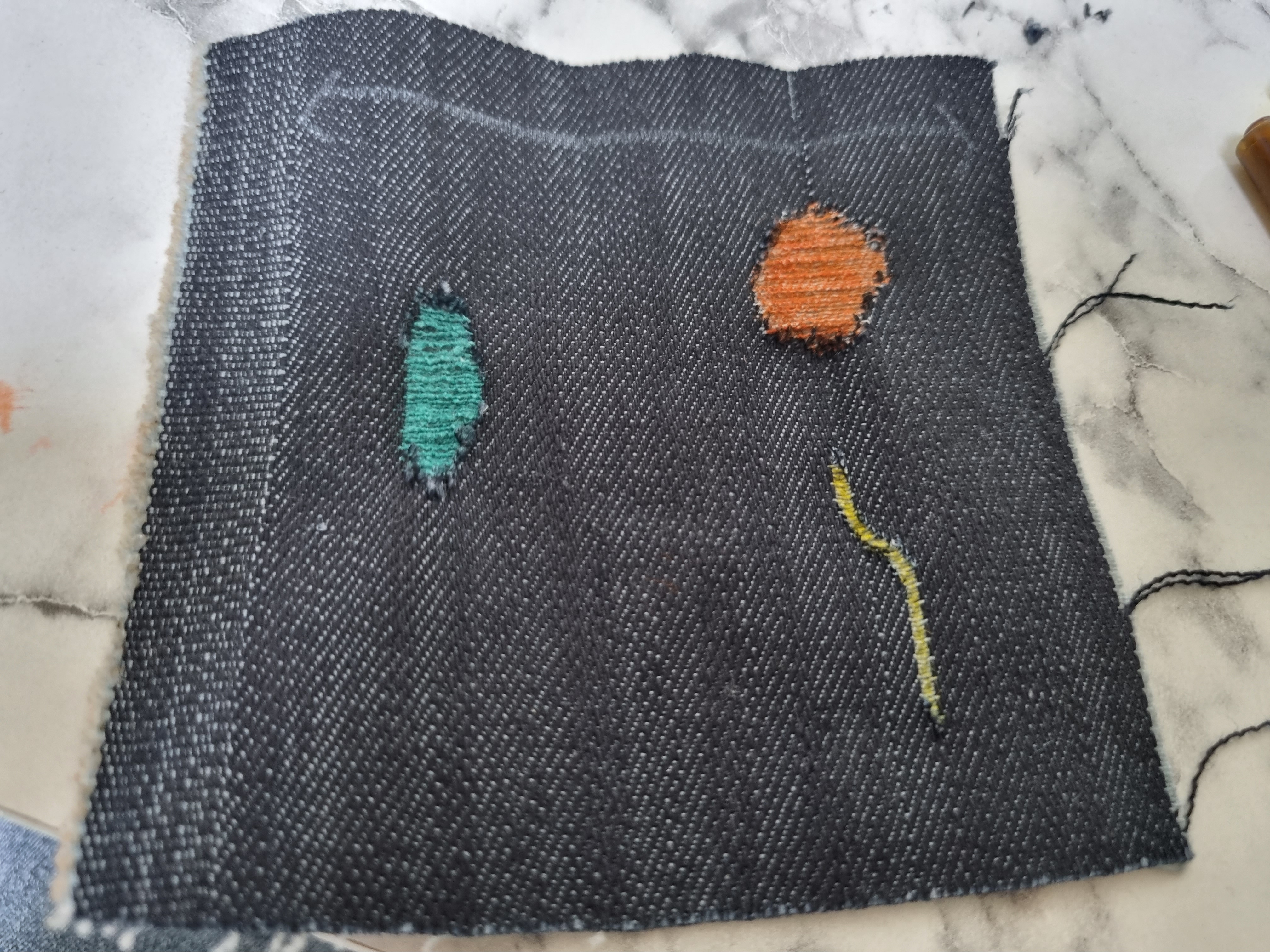 혹시나 색을 입히면 더 예쁠것 같아서 색도 입혀 봤어요. 필자는 패브릭 사이펜이 없어서 매직 사용했어요. 아동용 스크래치 청바지 만들 때는 패브릭 싸인펜 사서 노랑색으로 칠해야겠어요. 노랑색이 귀엽고 예쁠 것 같아요. 물론 필자의 개인 취향이에요.