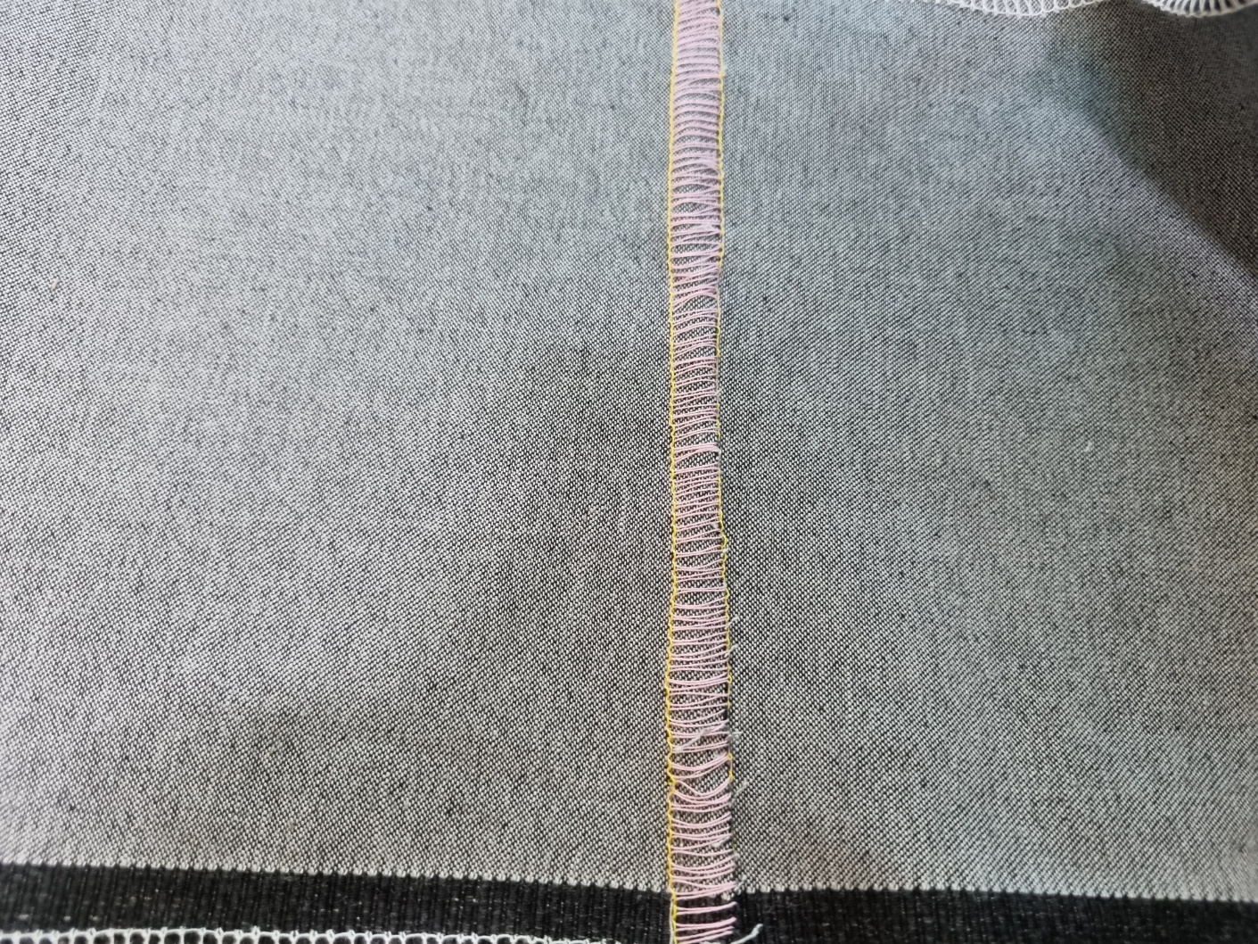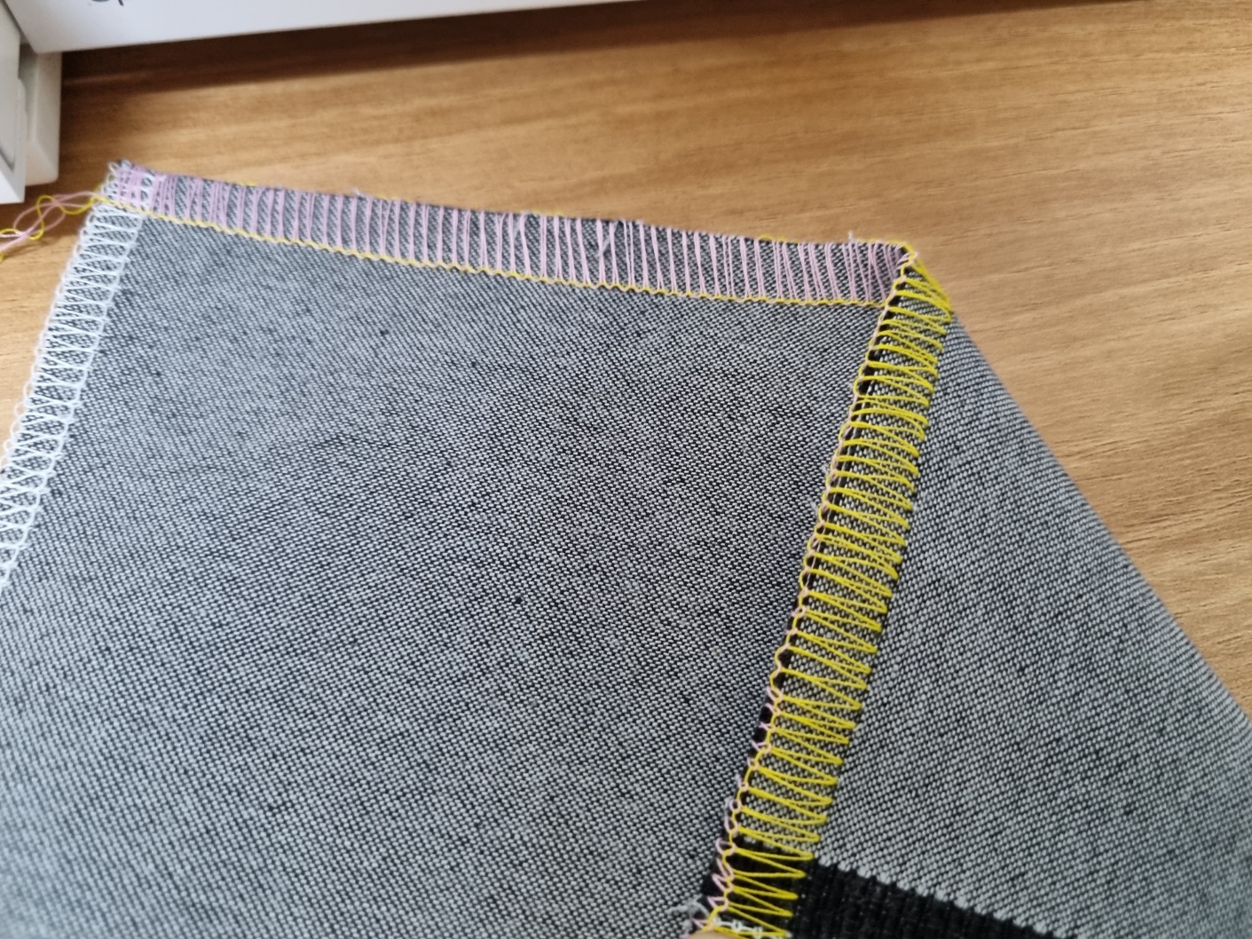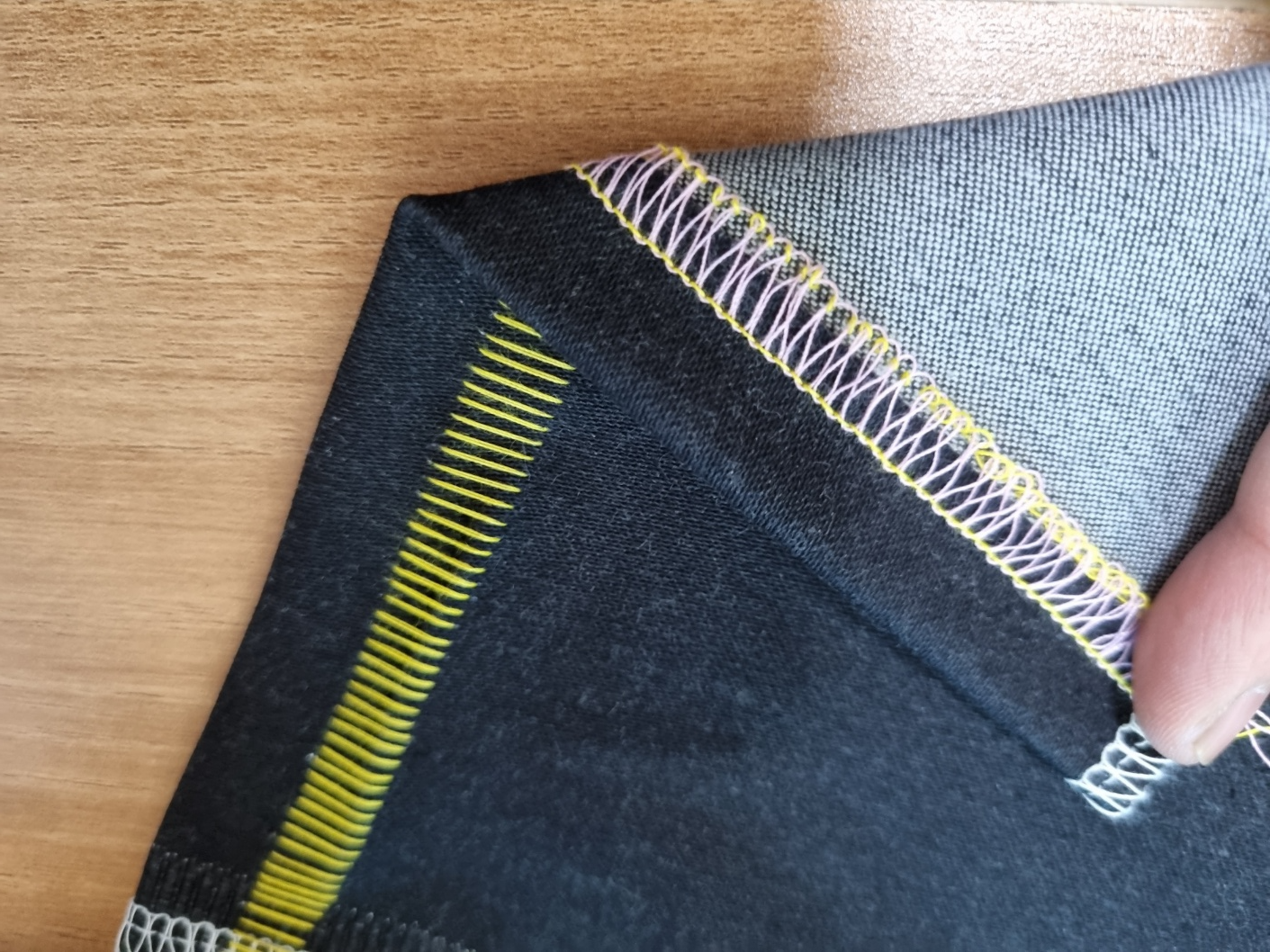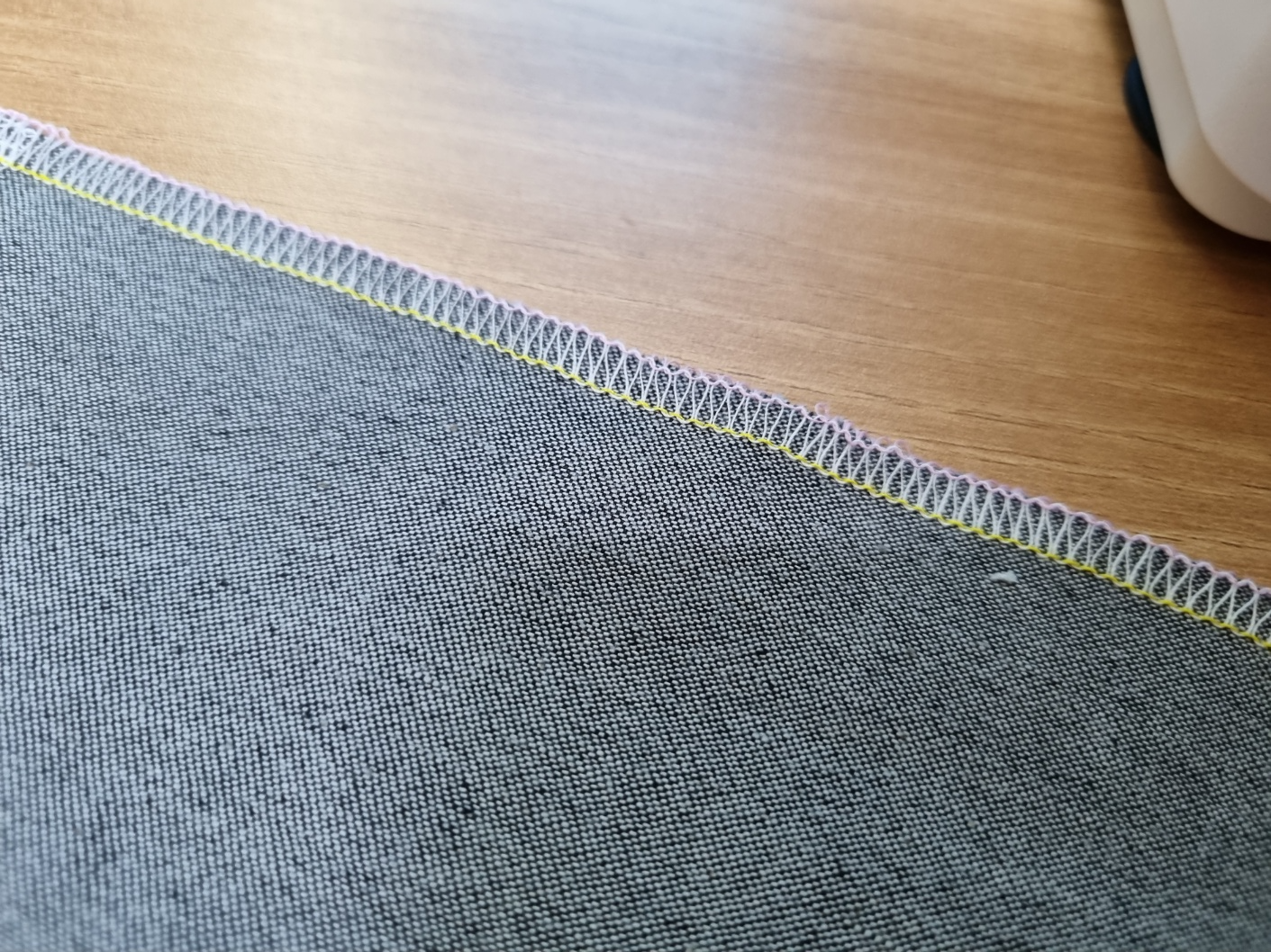위의 사진과 같은 바느질 패턴이 완성돼요. 앞과 뒤를 함께 보이도록 사진을 찍었어요. 노랑색 실이 보이는 쪽이 겉이에요. 뒷면에 분홍색 실도 보여요. 원단의 끝도 보여요. 따로 오버룩 하지 않아도 밑단을 박을 수 있어요. 이거 영상으로 보면 더 신기해요.