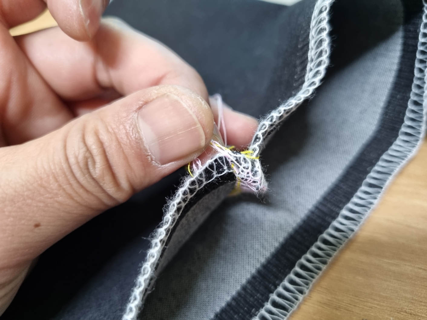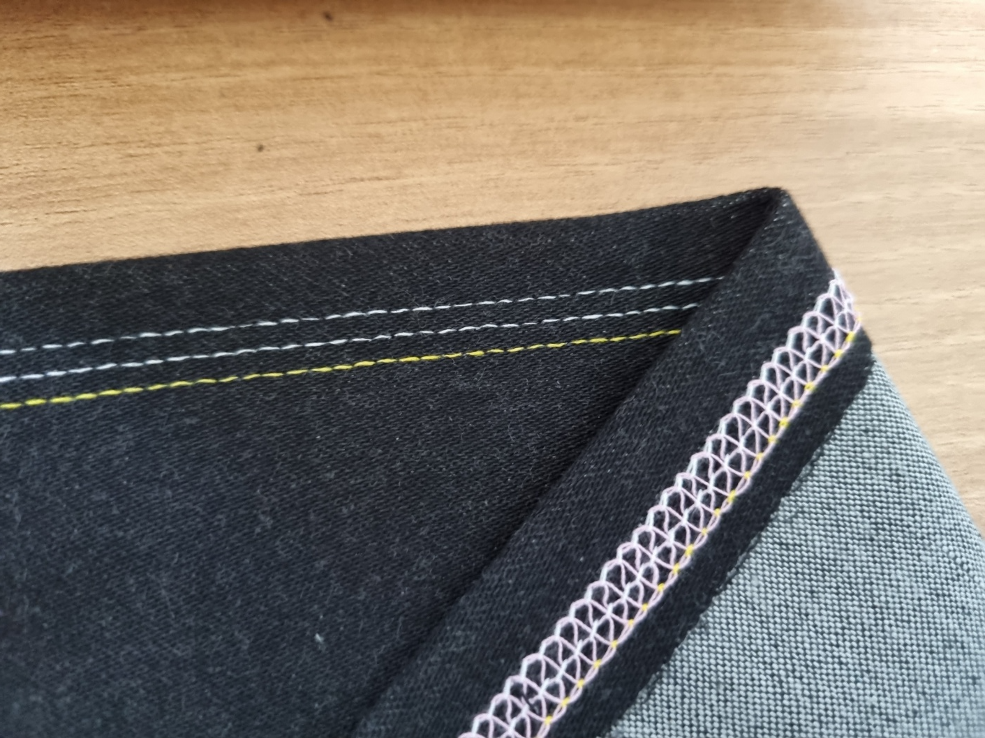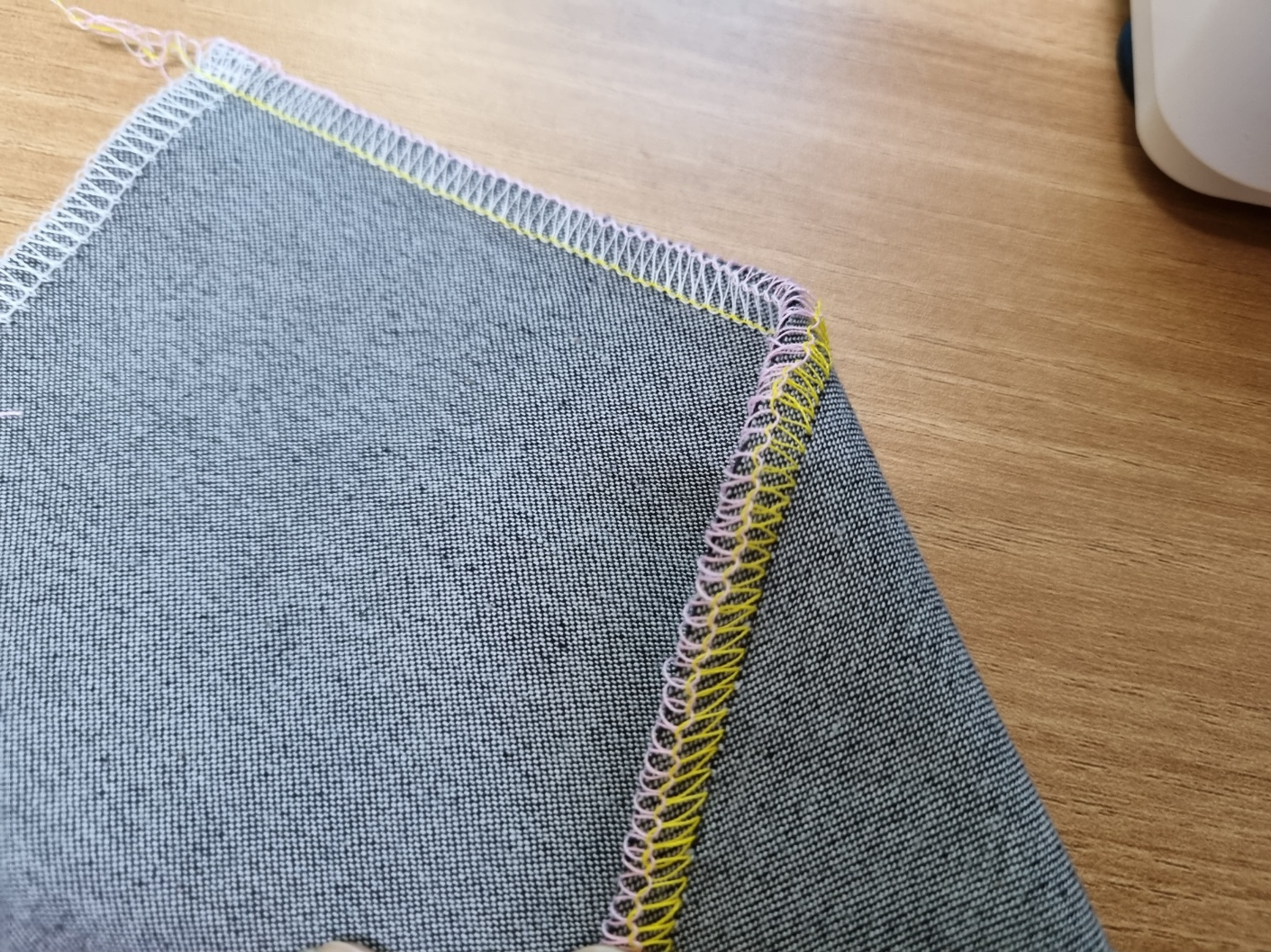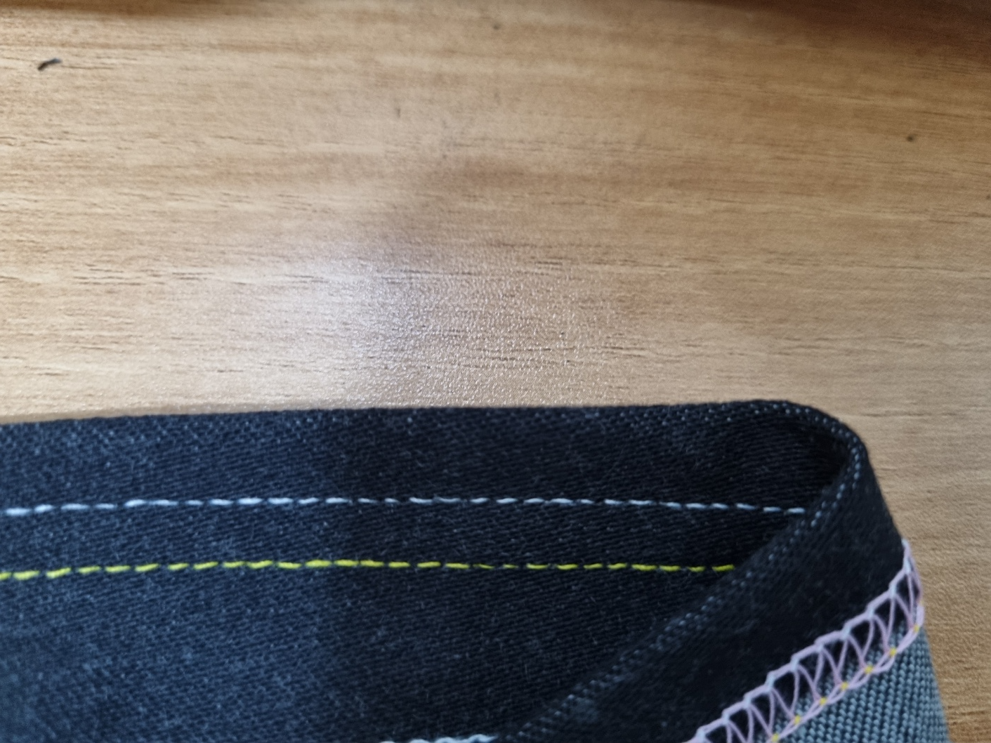 위의 사진과 같은 바느질 패턴이 완성돼요. 앞과 뒤를 함께 보이도록 사진을 찍었어요. 노랑색 실이 보이는 쪽이 겉이에요. 뒷면에 분홍색 실도 보여요. 원단의 끝도 보여요. 따로 오버룩 하지 않아도 밑단을 박을 수 있어요. 이거 영상으로 보면 더 신기해요.