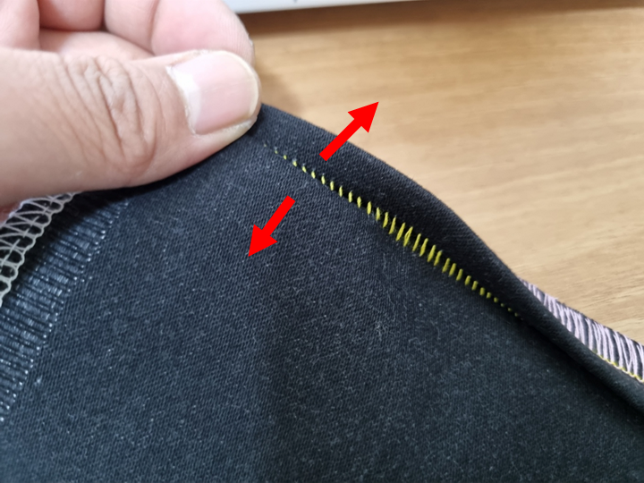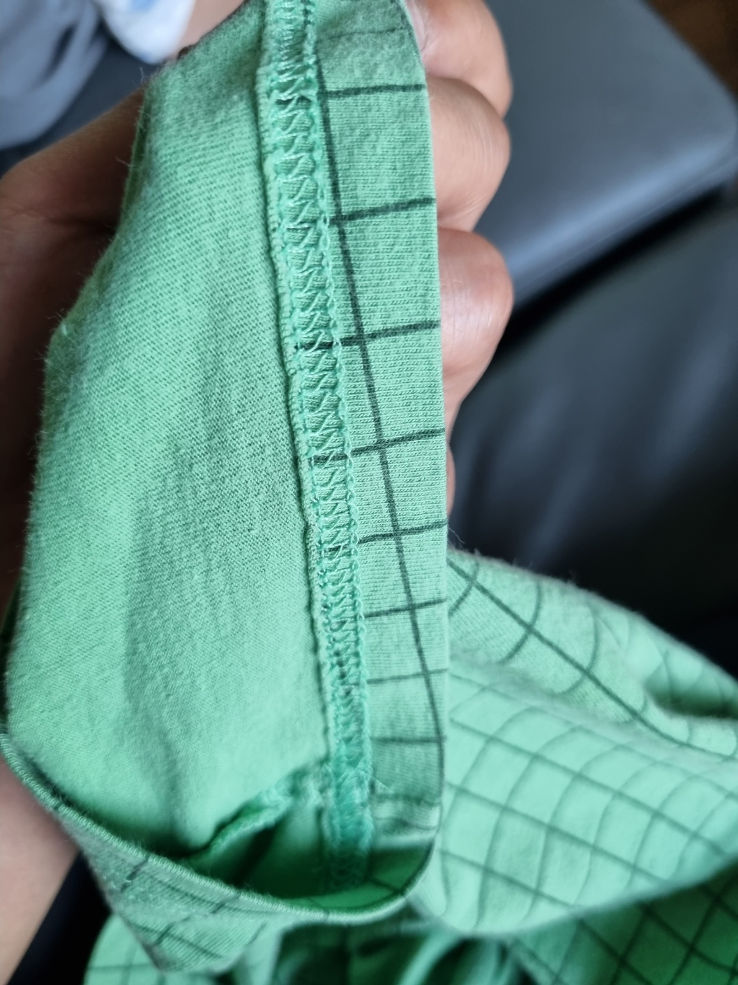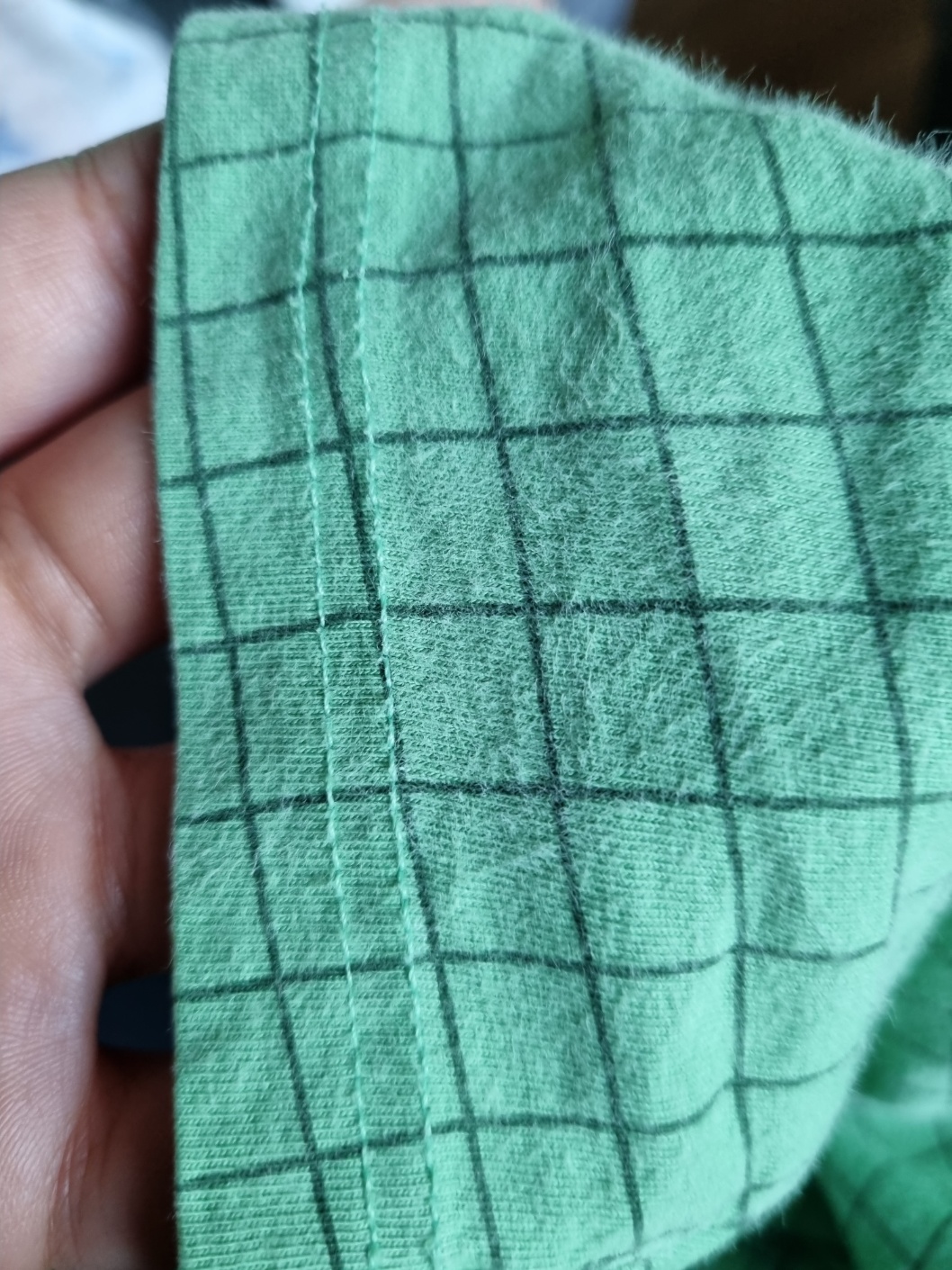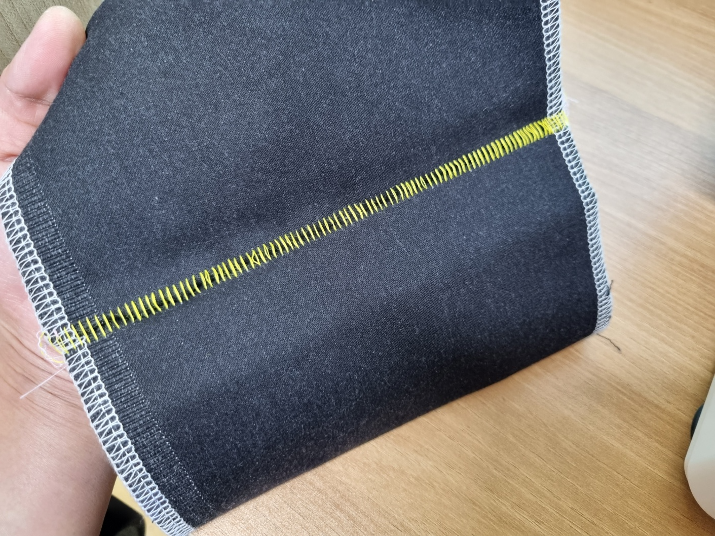 뒤집어 보면 위의 사진과 같은 모양이에요. 따로 오버룩을 하지 않고 끝단이 풀리지 않도록 마무리할 수 있어요. 이렇게 원단을 이어주는 바느질 패턴이에요. 그런데 이 패턴으로 어떻게 티셔츠의 끝단에 사용할 수 있는지 의아해할지도 몰라요. 사기 아니에요. 아래 설명할게요.