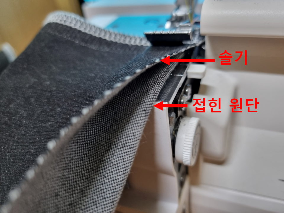 원단을 부채 접듯이 접어요. 위의 사진과 같이 접힌 원단 보다 솔기 부분을 밖으로 살짝 더 빼서 플랫룩으로 재봉해요.