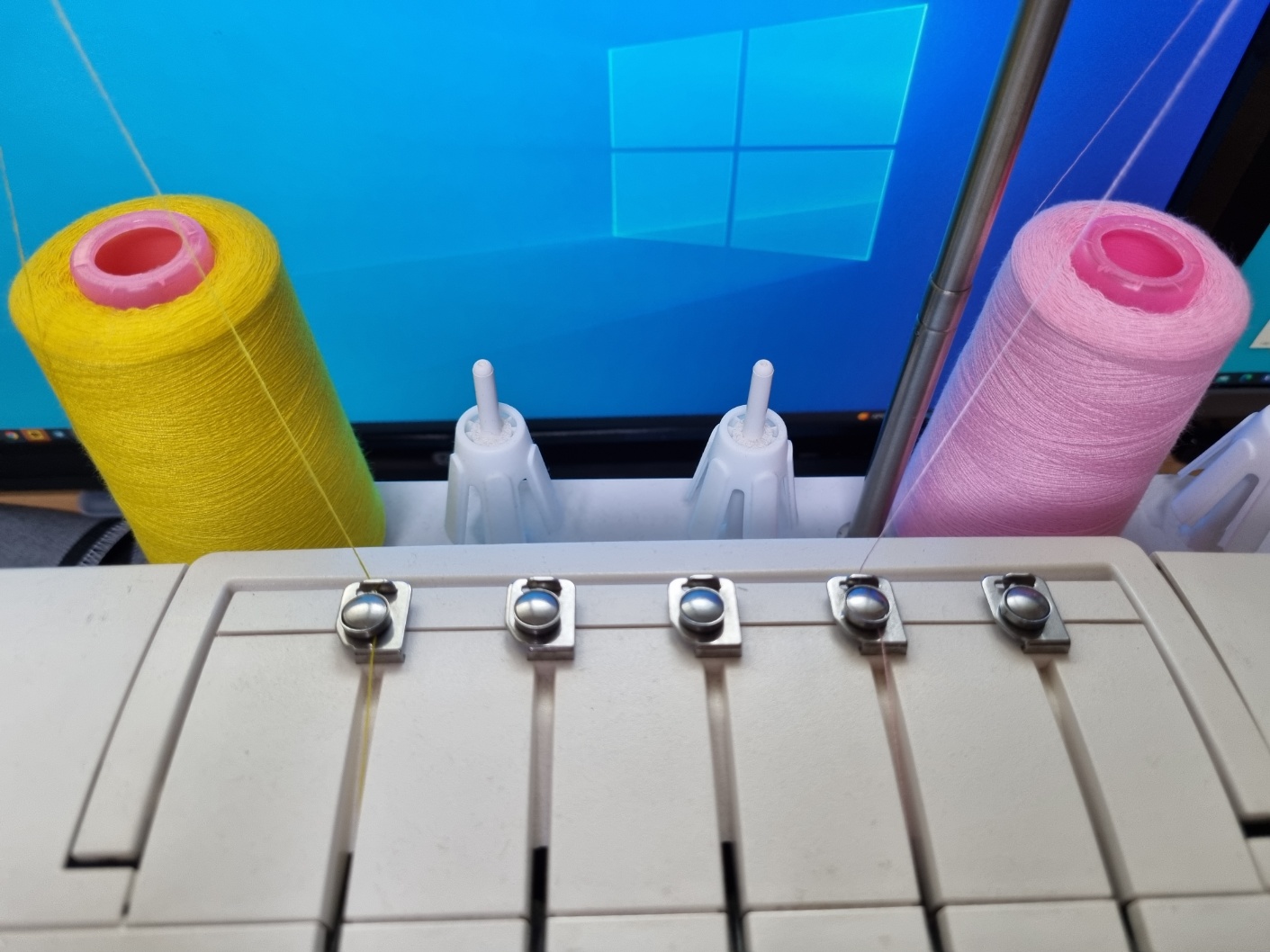 2색실 플랫룩을 하기 위해 노란색 실과 분홍색 실을 끼웠어요. 일부러 눈에 띄게 하기 위해서 원단과 상반되는 색의 실을 사용했어요. 노란색이 바늘실 이에요.