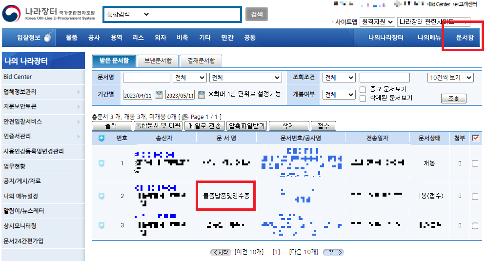 계약 체결일로부터 50일인지 60일인지 정확히 기억은 나지 않지만 어쨌든 납품 기한 내에 조달플랫폼 업체에서 납품을 했나 봐요. 나라장터 문서함에 물품납품 및 영수증이 보여요. 나라장터 로그인을 하면 문서함에서 볼 수 있어요. 수량, 외형 등을 검수하여 검수가 정상적으로 이루어졌다는 내용을 담고 있는 문서예요.