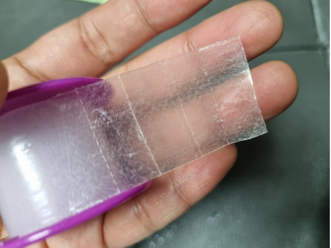 이형지가 2개 붙어 있어요. 흰색과 투명색. 투명색 이형지부터 떼어 내요. 그리고 흉터에 붙여요. 그런데 이 투명색 이형지가 잘 안 떨어져요. 한 장을 통째로 붙이면 이형지를 떼어 내기 쉽게 절단되어 있지만 가위로 잘라 서 쓰다보니 이형제 제거가 쉽지 않아요. 이형제 떼다가 실리콘 밴드가 접히는 경우도 종종 있어요. 그러면 접힌 부분만 가위로 잘라서 다시 써요. 아까워요.