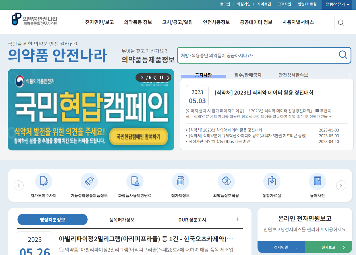 필자가 또 의료기기 및 의약외품에 대해 일가견이 있어요. 찾아요. 의약품안전나라(https://nedrug.mfds.go.kr/index)에서 의약품 또는 의약외품, 화장품 등의 정보를 확인할 수 있어요.