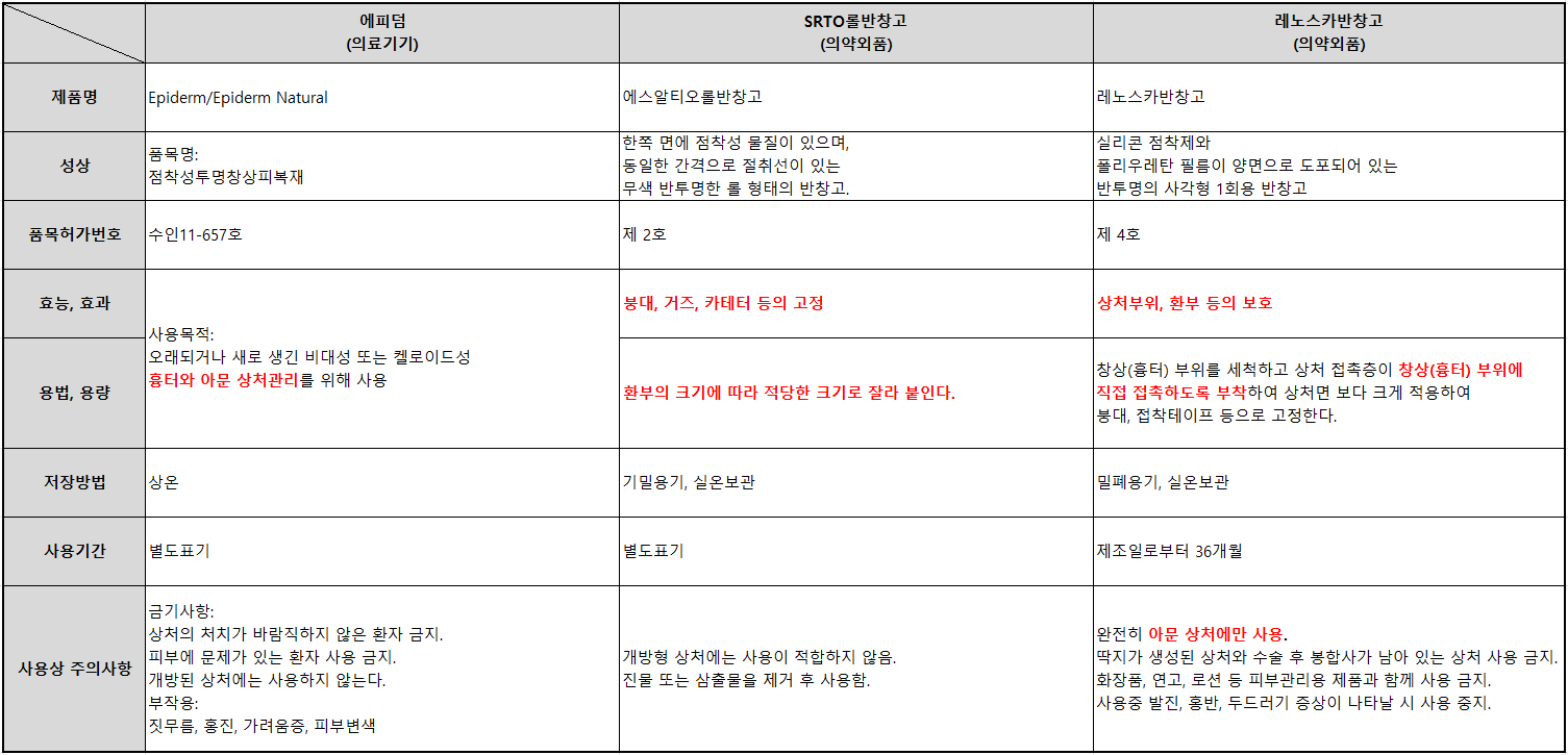 제가 이 정보를 왜 검색해서 찾았냐면 가격이 너무 사악해서 찾아봤어요. 가격은 에피덤(15x3.6cm) 4만 원대, SRTO(2.5x75cm) 5천 원대, 레노스카(4x9cm, 30장) 16만 원. 아무리 실비 적용이 된다지만 다 비슷한 제품인 거 같은데 가격 차이가 많이 심해요. 위의 표는 필자가 사용하는 3개의 비슷한 제품의 허가 사항을 비교한 표예요. 어차피 재질은 실리콘으로 3개 모두 똑같고, 효능, 효과와 사용목적에 중점을 두고 봤어요. 에피덤과 레노스카는 아문 상처에 직접 부착하여 상처를 관리하는 제품이에요. SRTO는 붕대, 거즈 등을 고정하는 용도예요. SRTO는 가격은 저렴하지만 상처 관리에 사용된다는 내용이 전혀 없어요. 이래서 가격 차이가 심했나 봐요.
