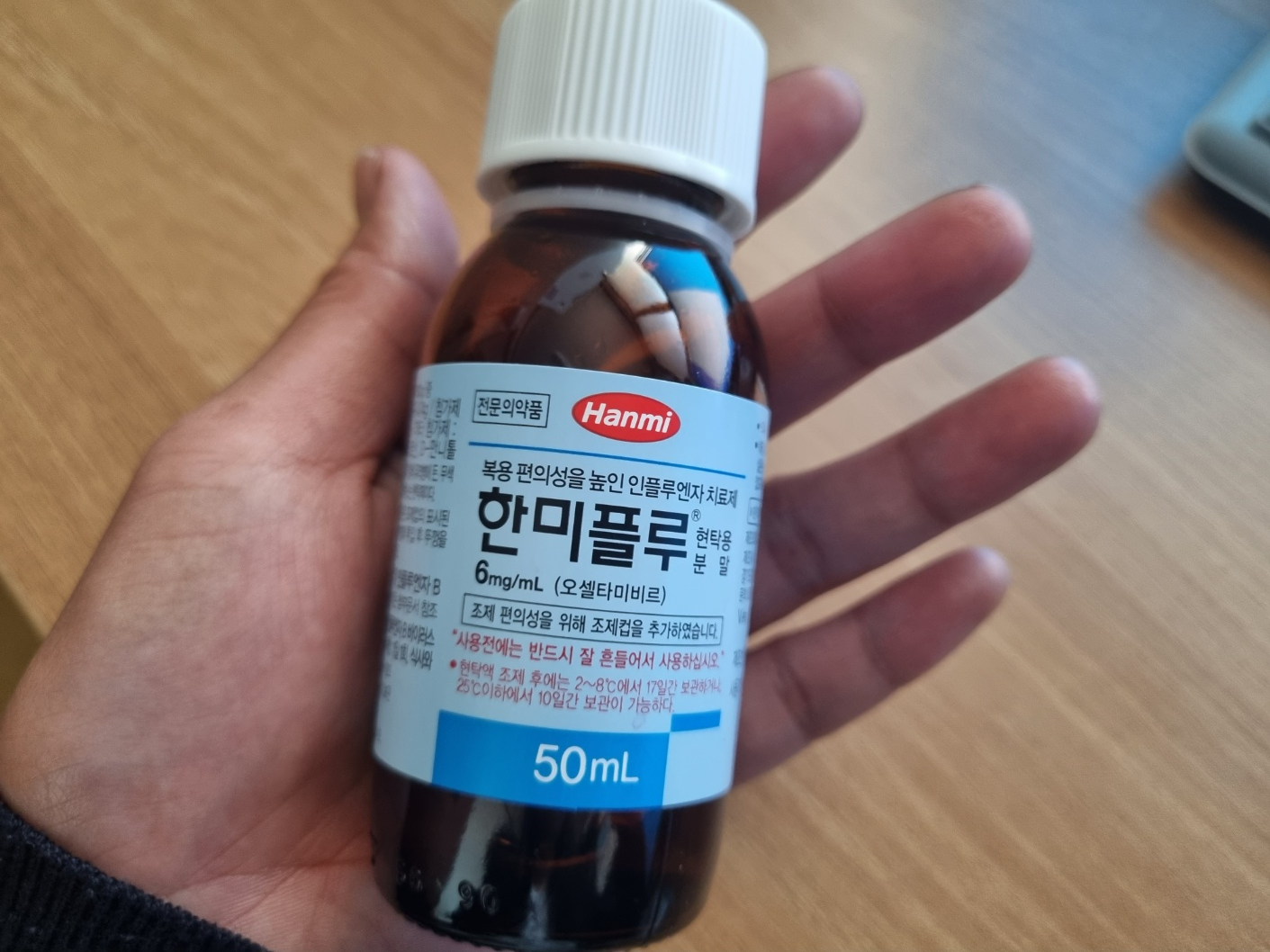 처방받은 약은 한미플루예요. 인플루엔자 A형 B형 치료약이에요. 독감 치료제로 쓰여요. 증상 개선 후에도 복용을 지속해야 된대요. 5일 동안.