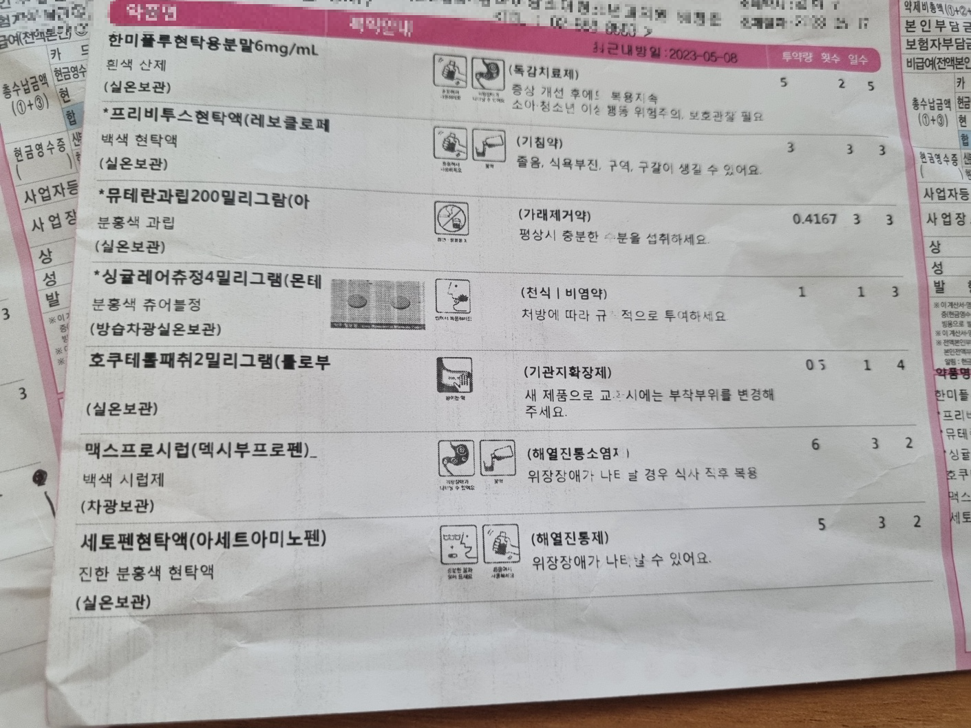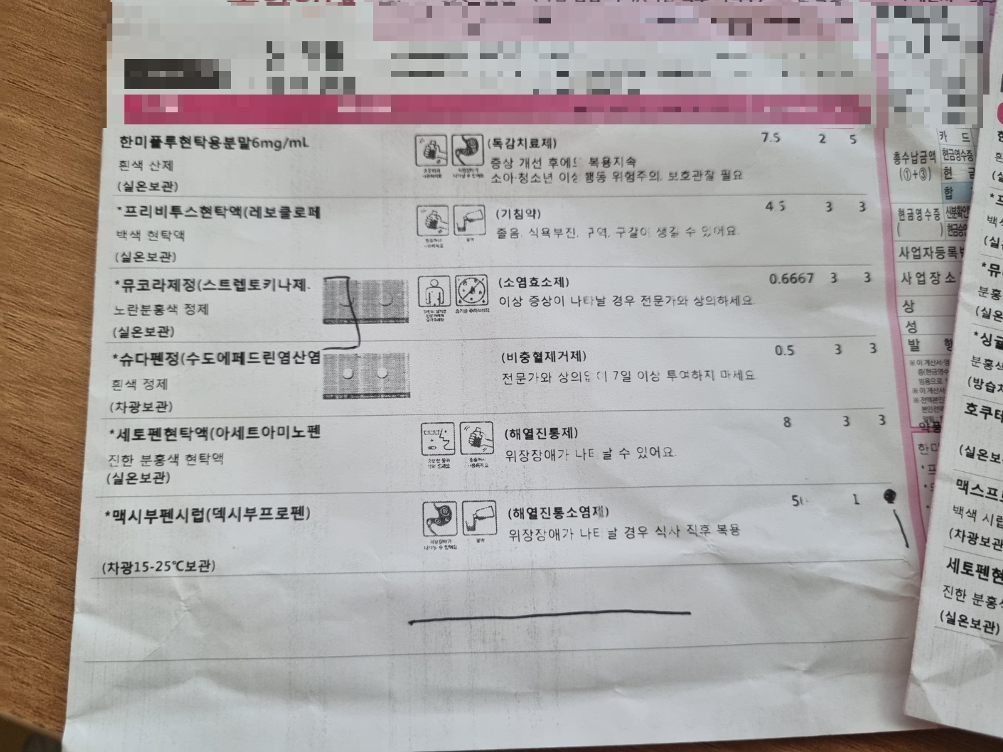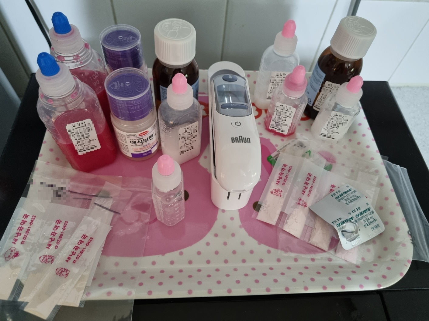 다행히 독감은 아니었어요. 그래서 감기약만 처방받아서 집으로 왔어요. 4일 치 감기약 받았어요. 하지만 해열제를 쓰지 않으면 다시 열이 나요.