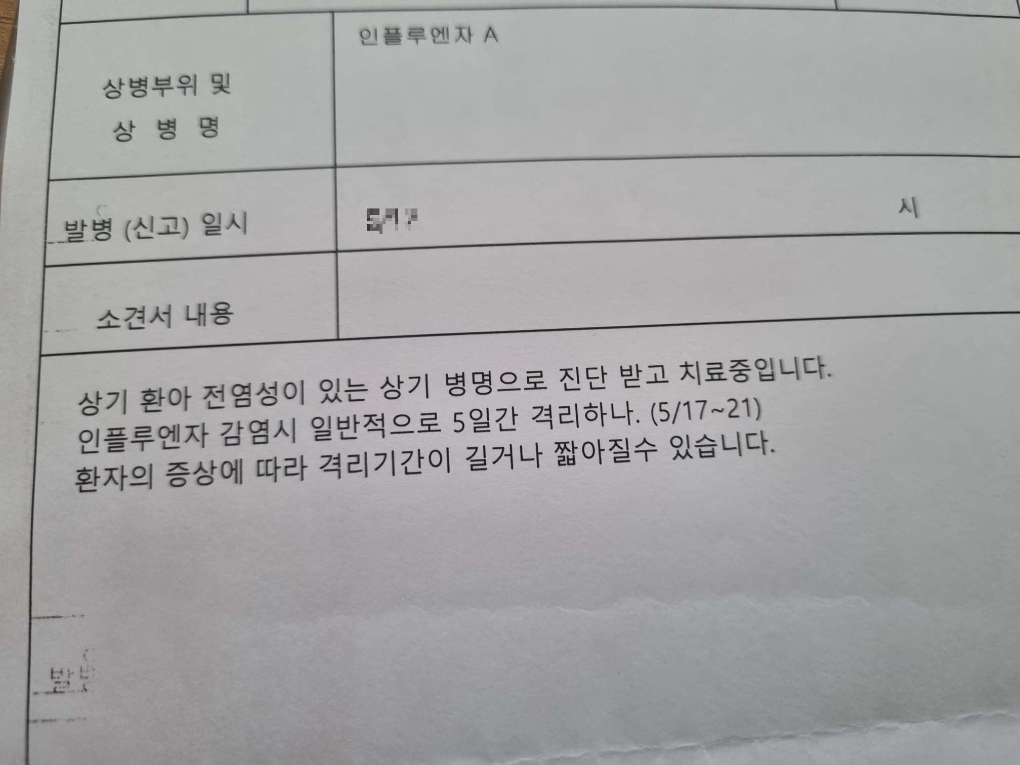 의사 선생님이 원칙적으로 5일 격리라고 했어요. 하지만 증상에 따라 격리 기간이 길거나 짦아질 수 있다고 했어요. 아이의 학교에서 온 가정통신문에는 해열제 없이 정상체온 회복 후 24시간이 경과할 때까지 등교 중지라고 했어요.