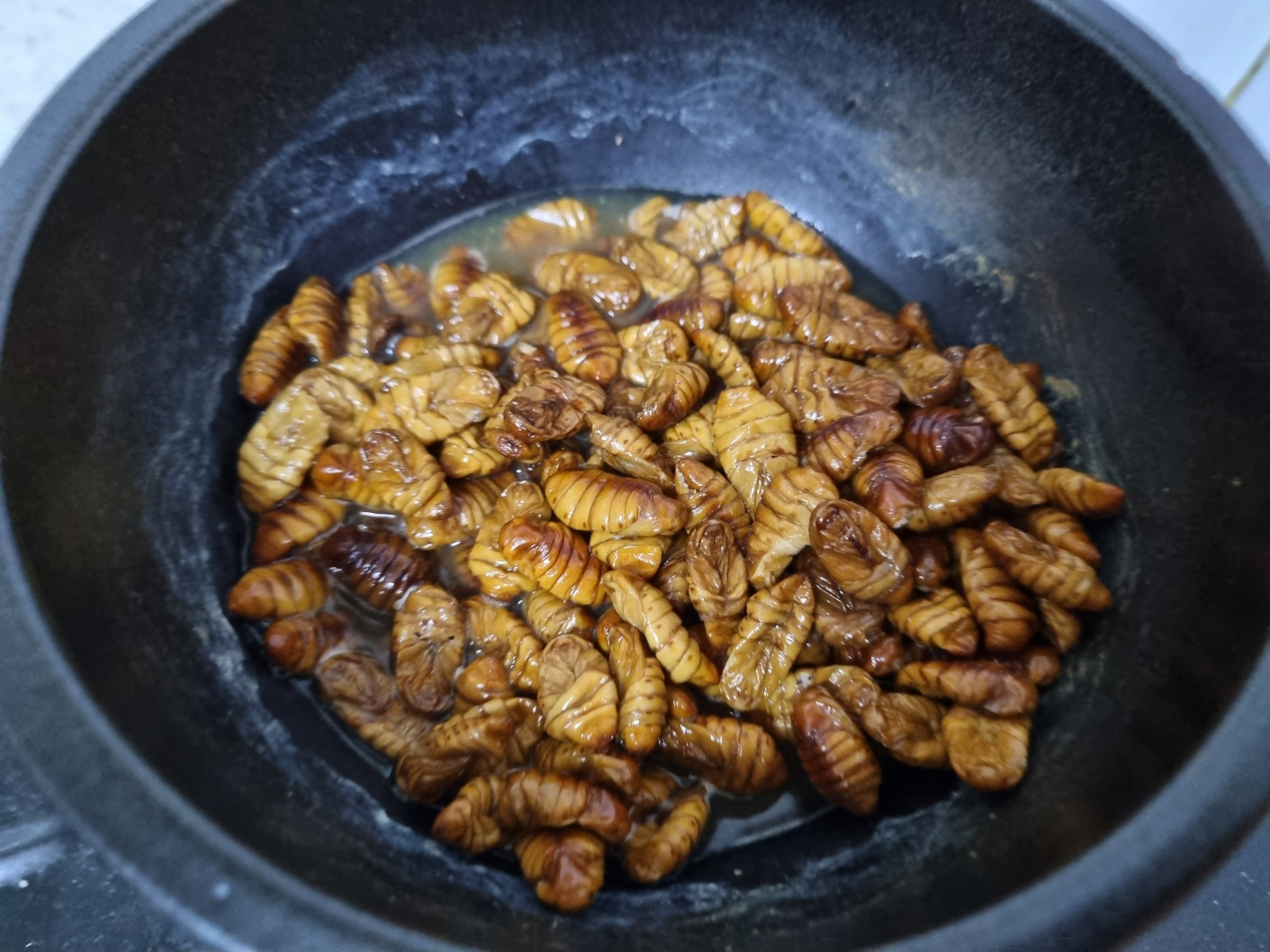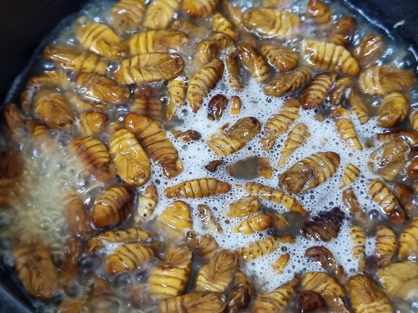 번데기의 50%는 수분이래요. 단백질 20%, 지방 10%, 칼슘, 인, 회분 등으로 이루어졌대요. 감이 와요. 다이어트, 헬스에 좋은 음식이에요.