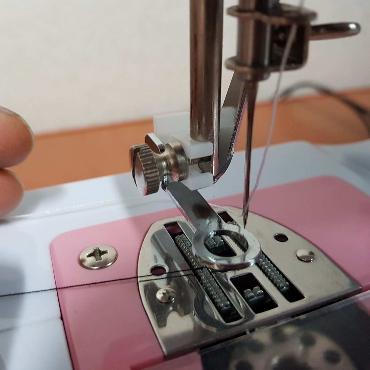 그리고 혼스 미싱에 아래 사진과 같이 주름 노루발을 장착하였다. 처음에 노루발을 어떻게 끼우는지 몰라서 당황했다. 혼스 미싱 자수 노루발은 원터치가 아니다. 나사를 풀어서 기존에 걸려있던 노루발과 노루발 지지대를 제거하고 주름 노루발로 장착해야 한다.