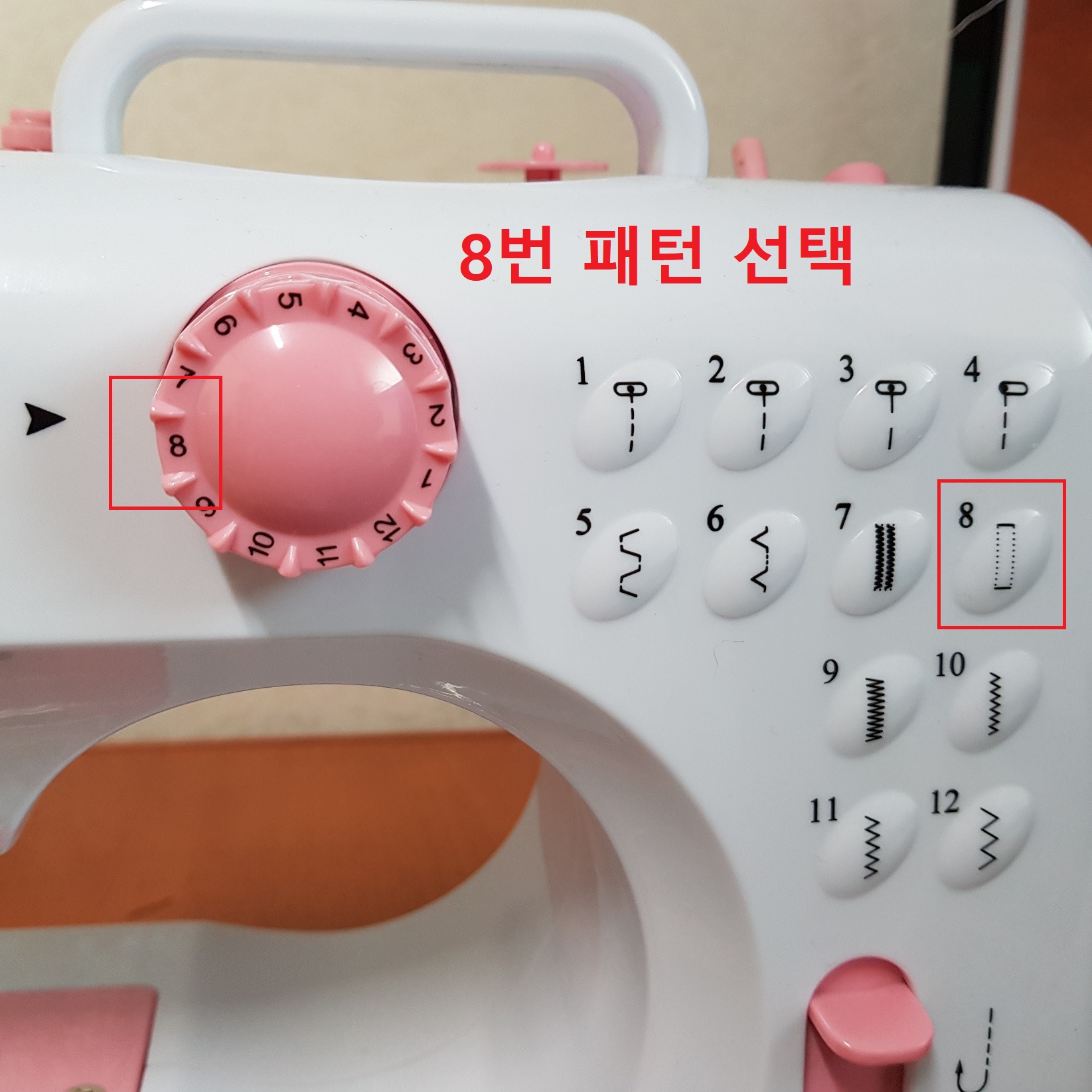 패턴은 8번을 선택했다. 8번 패턴은 원래 단추 구멍을 만들 때 사용하는 패턴이지만 자수 넣기에도 적합하다. 8번 패턴은 좌, 우로 제자리 박음질되기 때문이다. 원단을 상, 하, 좌, 우 손으로 움직여야 하는 자수 넣기 특성상 8번 패턴이 아주 적합하다고 생각한다. 그렇다고 다른 패턴이 안 되는 것은 아니다. 다른 패턴도 자수 넣기가 가능하다.