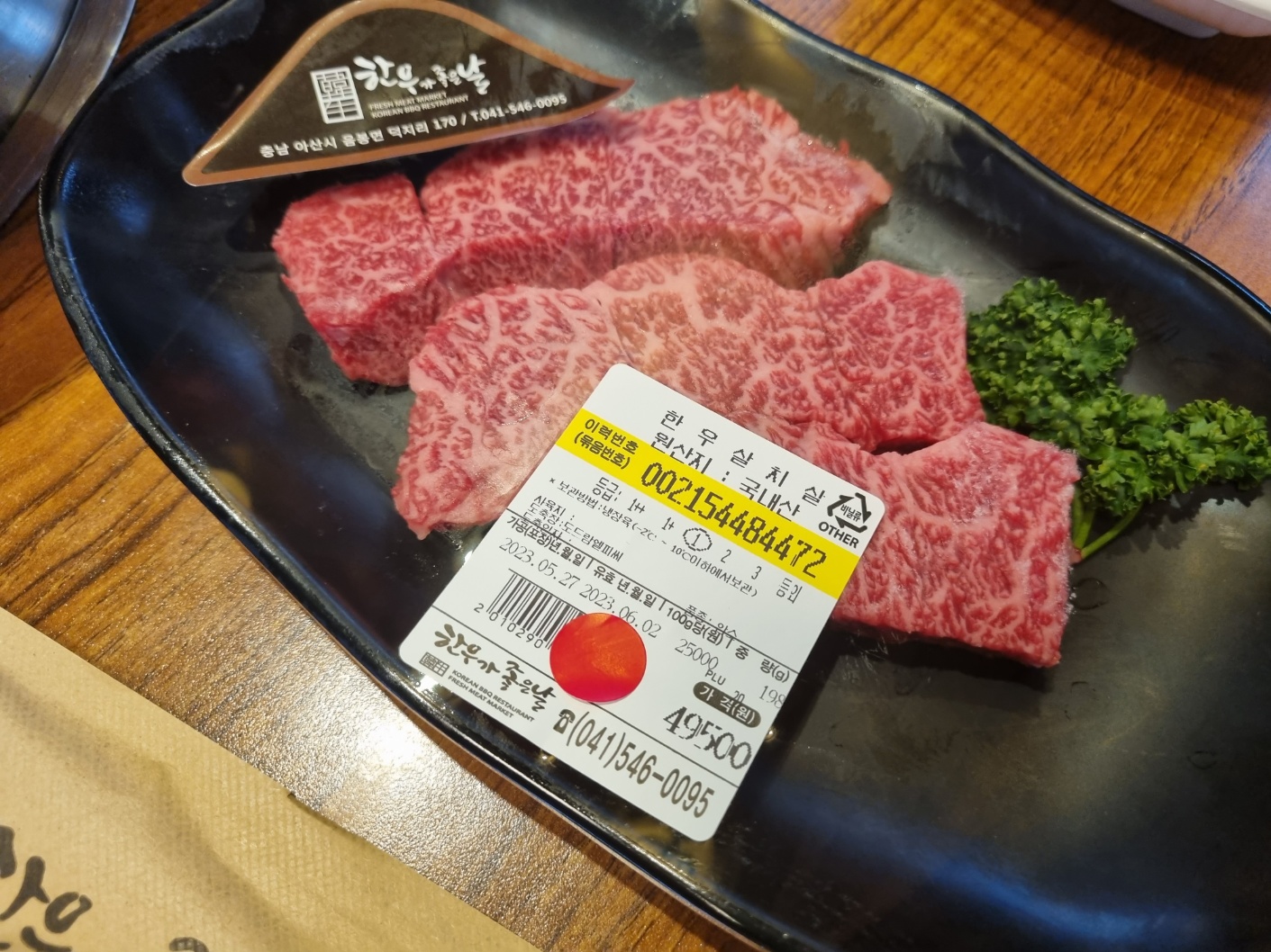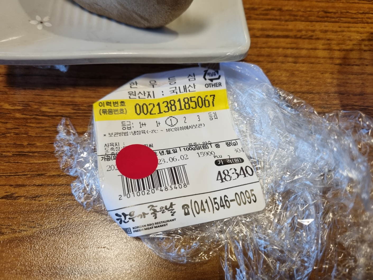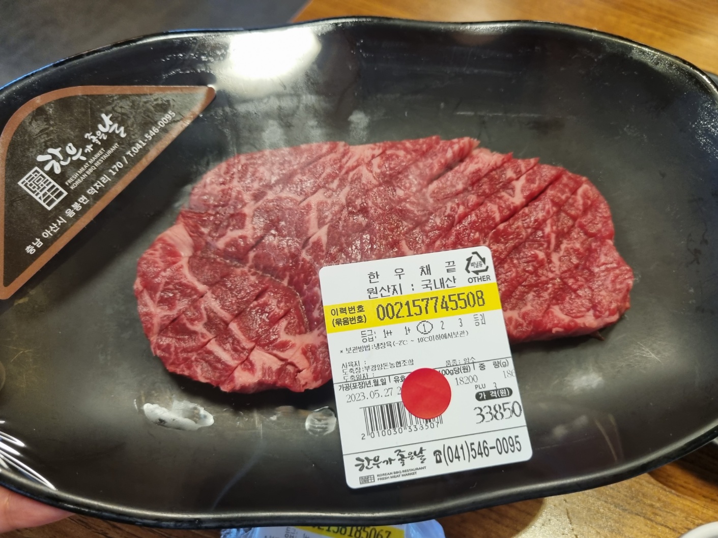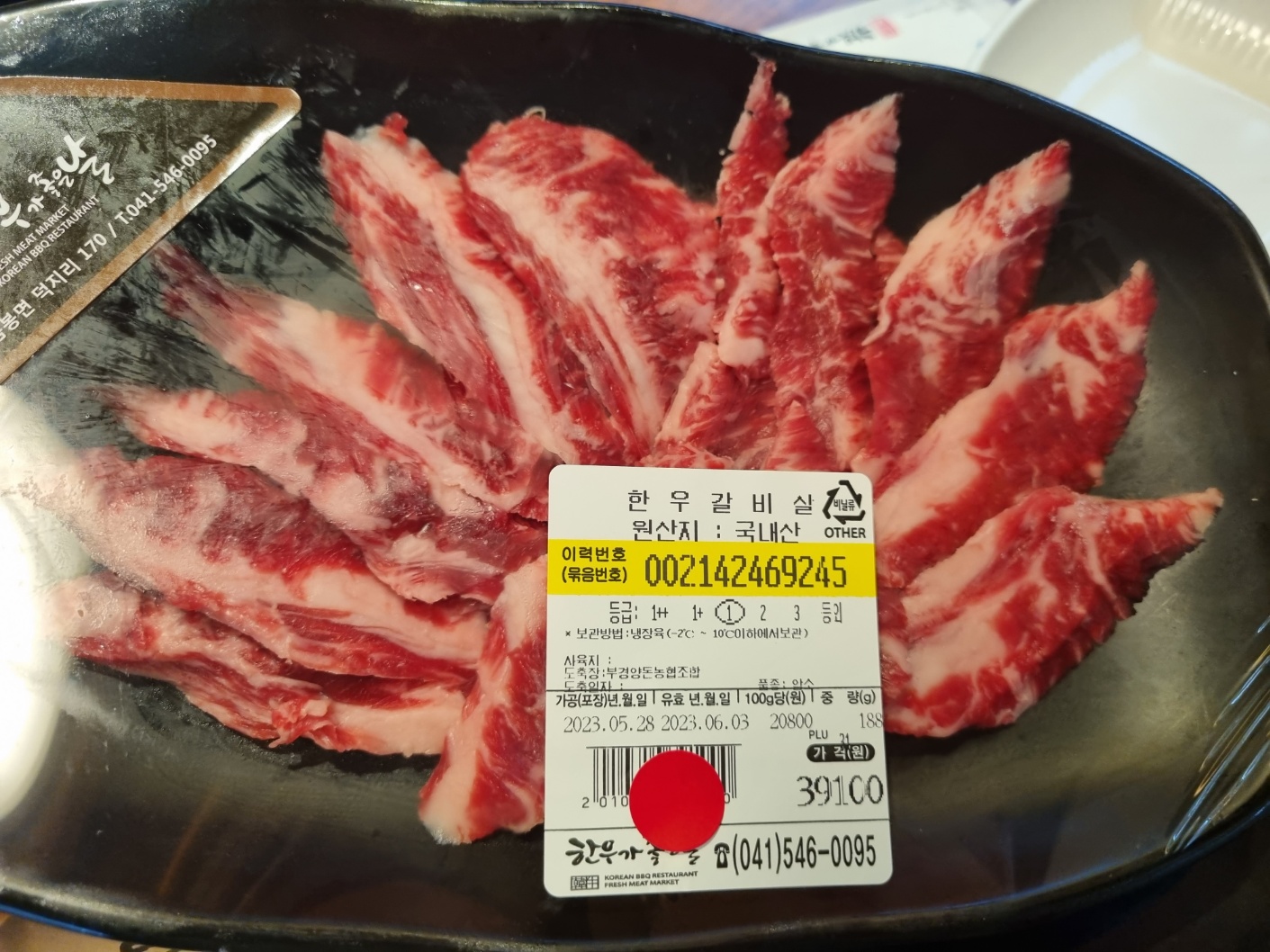 고기를 이것저것 골랐어요. 결제를 하면 빨간 스티커를 붙여줘요. 필자가 좋아하는 살치살, 식감 좋은 갈빗살, 구우면 맛이 좋은 등심 등등. 보통 한 접시당 200g 정도가 담겨 있어요. 등급은 모두 1등급이에요. 한우가 비교적 저렴한 이유예요. 필자는 투뿔 아니면 수입 소와 차이를 잘 몰라요. 소알못이에요. 투뿔은 절대 익혀 먹지 않아요. 사시미 또는 육회로 먹어야 담백하고 맛있어요. 사실 필자는 1등급을 100g당 15,900원에 먹느니 그냥 호주산 먹어요. 필자의 생각으로 가성비가 좋은 건 아니라고 생각해요. 하지만 만사가 귀찮을 때 종종 이용하는 곳이에요. 깔끔하기도 하고 고기맛도 나쁘지 않아요.