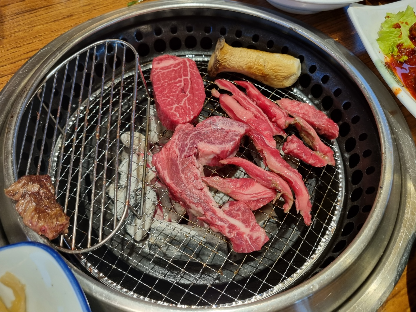 고기 굽는 사진이 없는 줄 알았어요. 다행히 찾으니까 있어요. 갈빗살, 눈꽃살, 안심을 굽고 있어요. 눈꽃살은 우리가 흔히 알고 있는 새우살과 같아요. 새우 모양으로 생겼어요. 토마호크 먹을 때도 새우살이 있었는데 필자는 새우살이 특별히 맛있게 느껴지지는 않아요. 소알못이에요. 그냥 다 맛있어요.