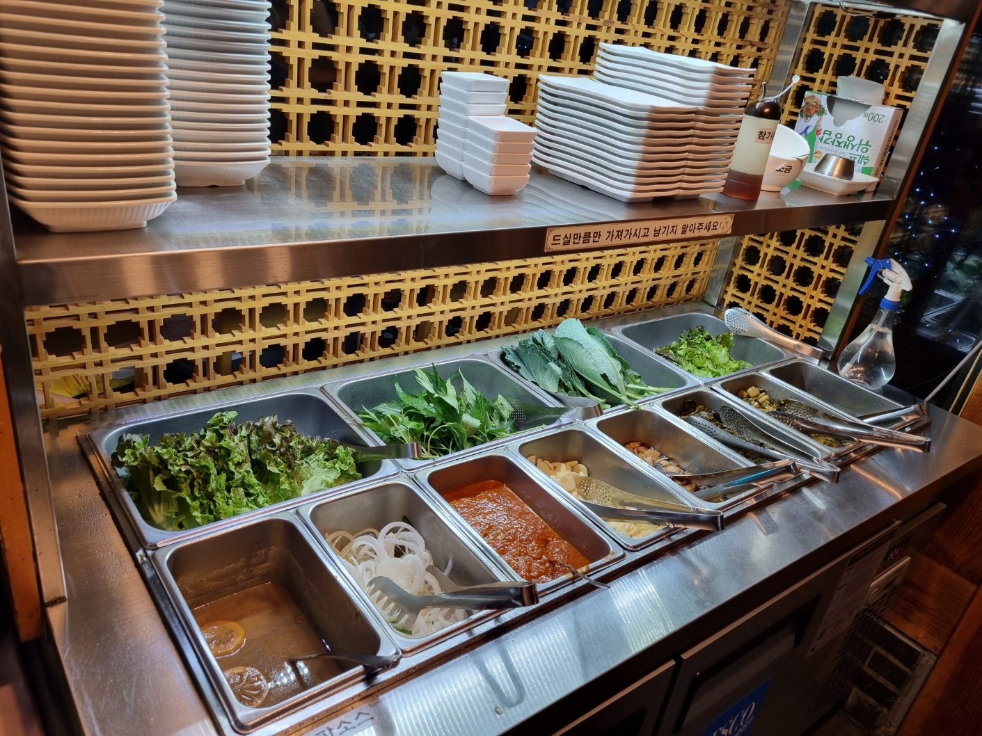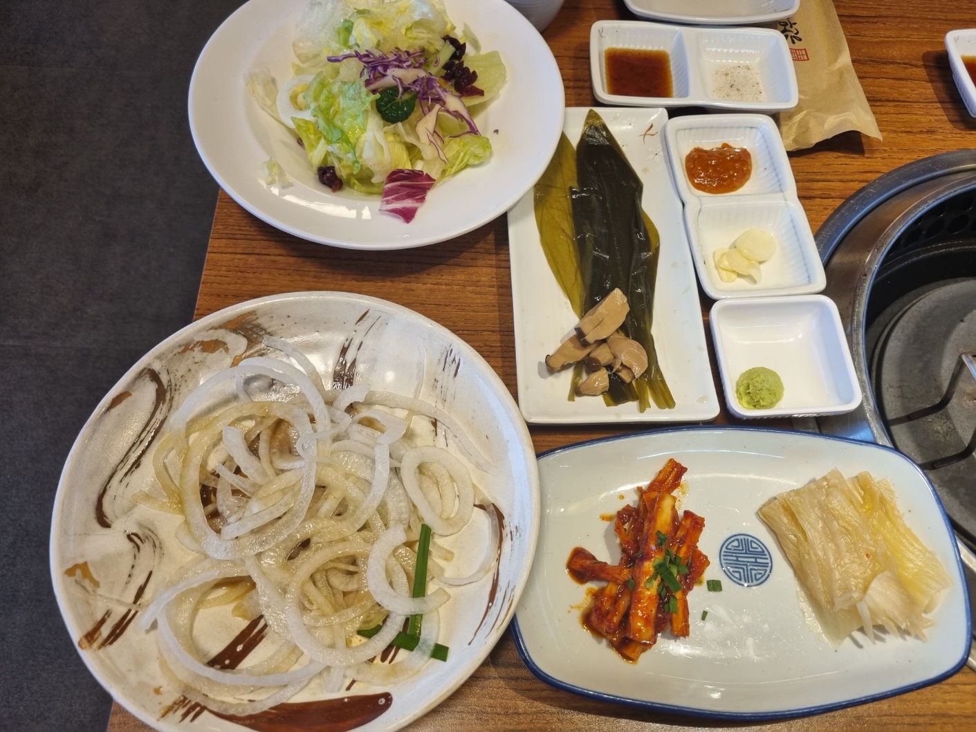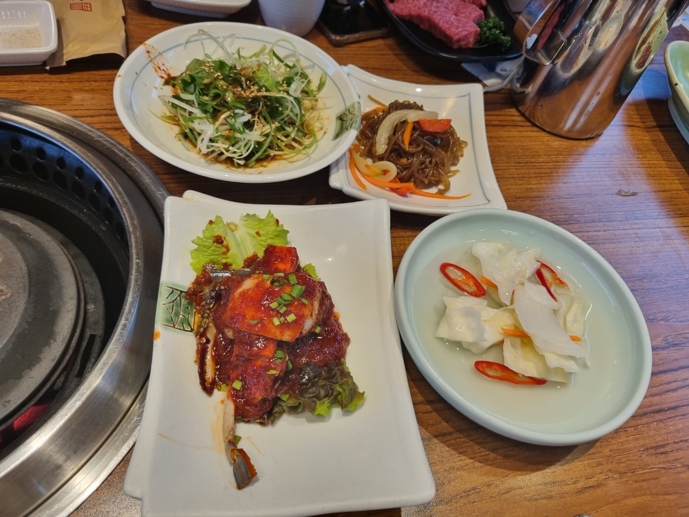 숯불이 피워지는 동안 반찬들이 나와요. 양념게장, 잡채, 풀, 풀, 풀, 풀. 그냥 그래요. 필자는 이런 것들을 좋아하지 않아요.