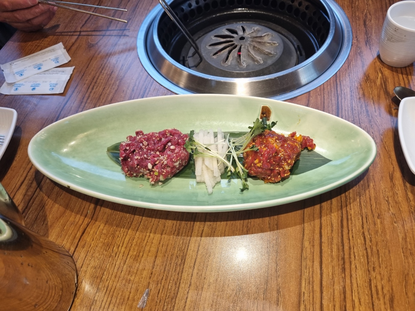 애피타이저로 육회를 먹었어요. 지난번에 방문했을 때는 육회가 없다고 해서 못 먹어서 아쉬웠는데 드디어 맛을 봤어요. 고추장 육회와 소금으로 간을 한 육회가 나와요. 말해 뭐 하겠어요. 당연히 맛있어요. 달달했어요. 필자는 개인적으로 고추장 육회보다 소금으로 간을 한 육회를 더 좋아해요. 둘 다 모두 달달했어요. 달달한 육회는 별로라고 생각했는데 그런대로 먹을만했어요.