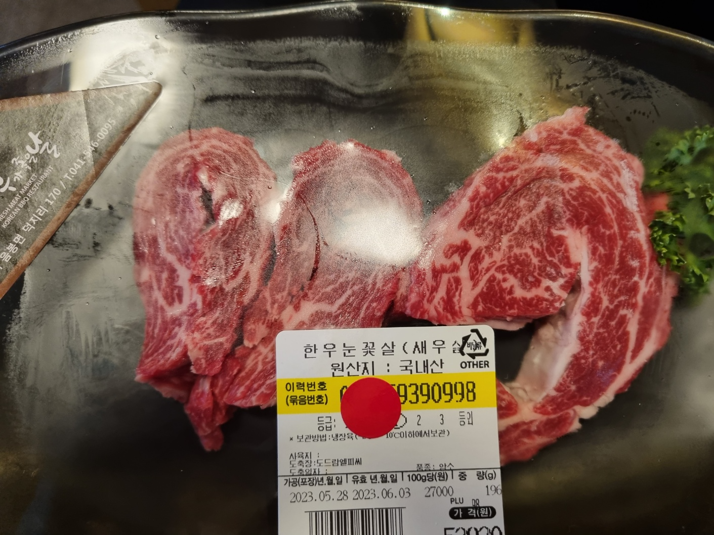 첫 번째 결제한 고기 다 먹고 두 번째 결제하고 가져온 눈꽃살이에요. 지금 보니깐 가격이 깡패예요. 100g에 27,000원. 고기 한 점에 5천 원이네요.