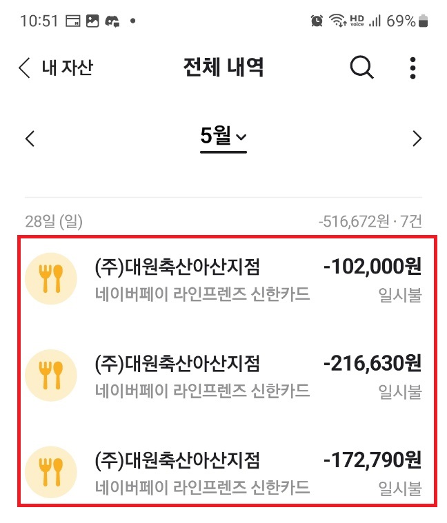 영수증에 한우가 좋은 날 상호명이 (주)대원축산아산지점으로 나와요. 처음에 17만 원 고기를 사고, 두 번째 21만 원어치의 고기를 사고 마지막에 나올 때 상차림비, 술값, 냉면 등 10만 원 결제됐어요. 거의 50만 원 정도 나왔어요. 고기 10 접시 정도. 성인 6명, 아이 2명 먹었어요. 평소에 이렇게 많이 먹지 않는데 가족 모임이고 가족 중 한 명이 1kg 먹는 친정 오빠가 있어요. 다음부터 친정 오빠는 라면 1개 끓여서 먹이고 데려와야겠어요.