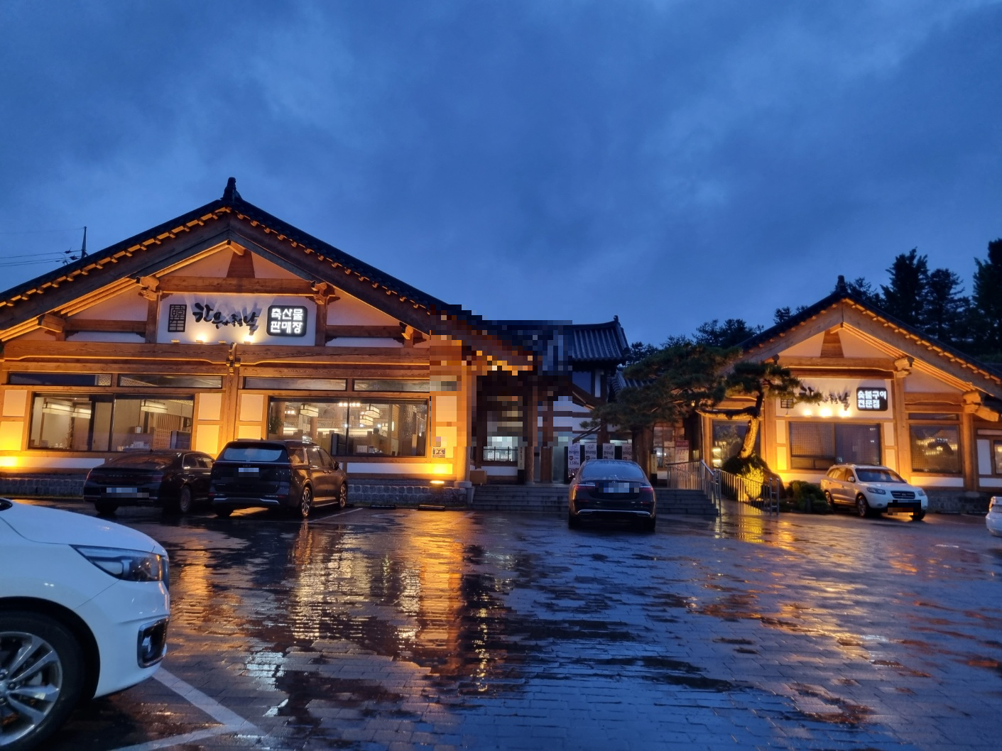 비가 와요. 위의 사진에서 왼쪽 건물은 고기 파는 곳이에요. 오른쪽은 고기를 구워 먹을 수 있는 곳이에요. 정육식당과 비슷해요. 왼쪽 건물에서 고기를 고르고 결제를 해요. 오른쪽 건물로 들어가면 자리를 안내해 줘요. 상차림비가 따로 있어요.