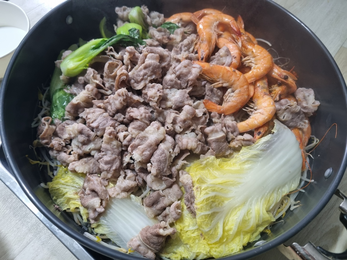 2번째 판에는 숙주 깔고, 알배기, 청경채 넣고 새우 조금, 우겹살을 넣었어요. 사실 차돌도 샀는데 차돌이 좋아 보이지 않아서 일단 우겹살만 넣었어요. 20분 동안 쪄요.