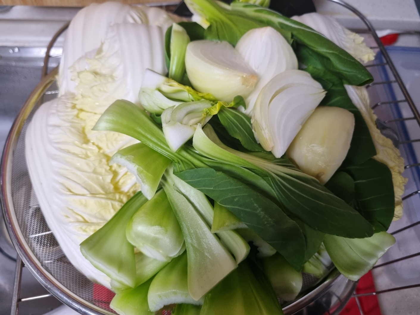 필자가 좋아하는 알배기와 청경채도 샀어요. 생각보다 양이 너무 많아요. 역시 집에서 만들면 외식비보다 저렴하고 푸짐하게 먹을 수 있어요. 양파는 육수에 넣을 재료예요.