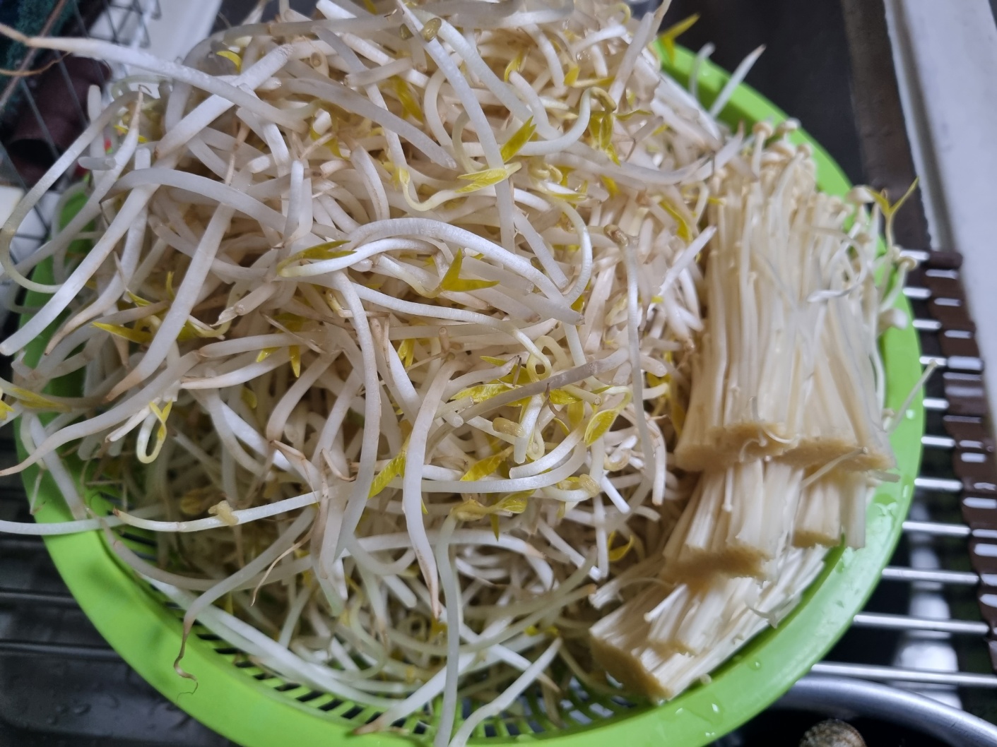 빠질 수 없는 숙주도 샀어요. 아이들이 좋아하는 팽이버섯도 하나 샀어요. 씻어요.