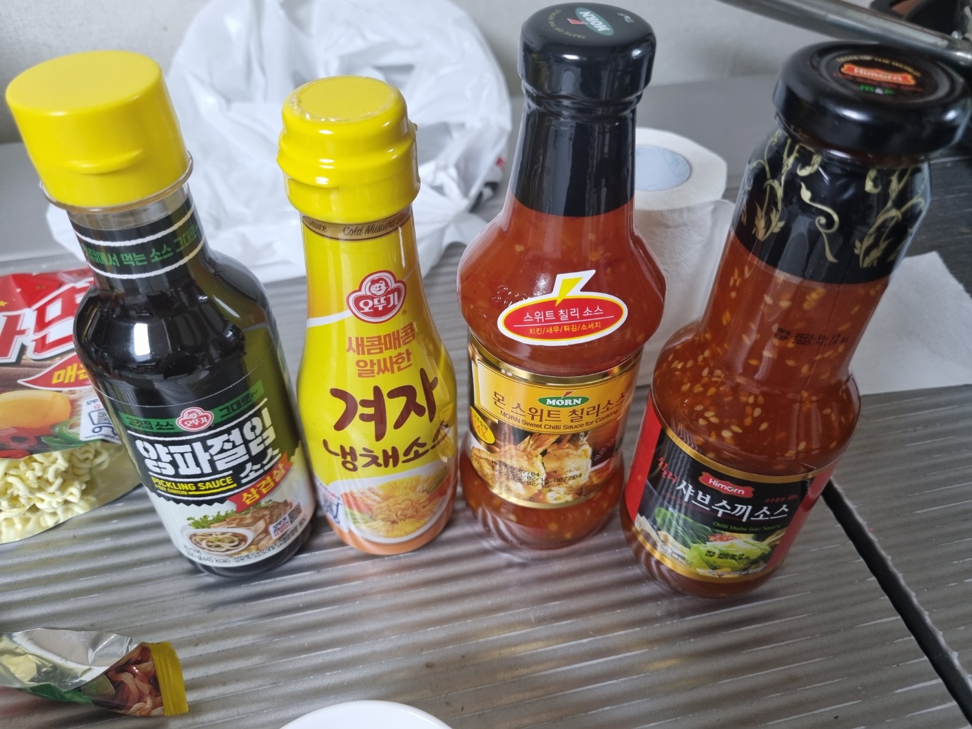 기다리는 동안 소스를 준비해요. 양파절임 소스, 겨자 냉채소스, 스위트 칠리소스, 샤브수끼 소스. 아이들 먹으라고 몬 스위트 칠리소스도 샀는데 아이들은 소스를 먹지 않아요.