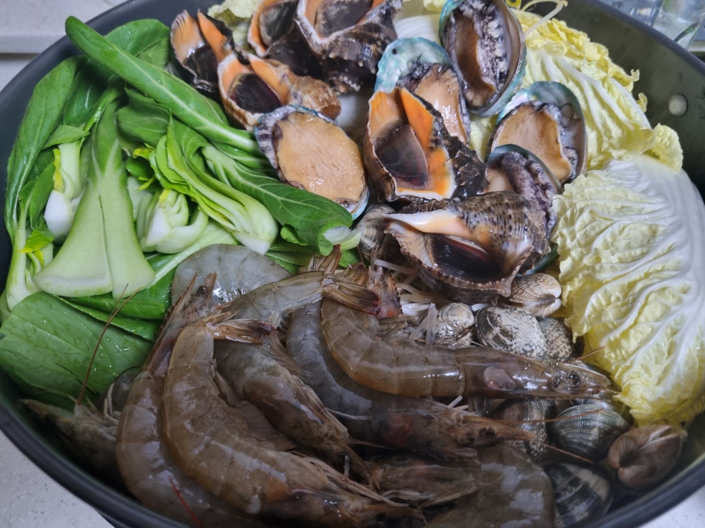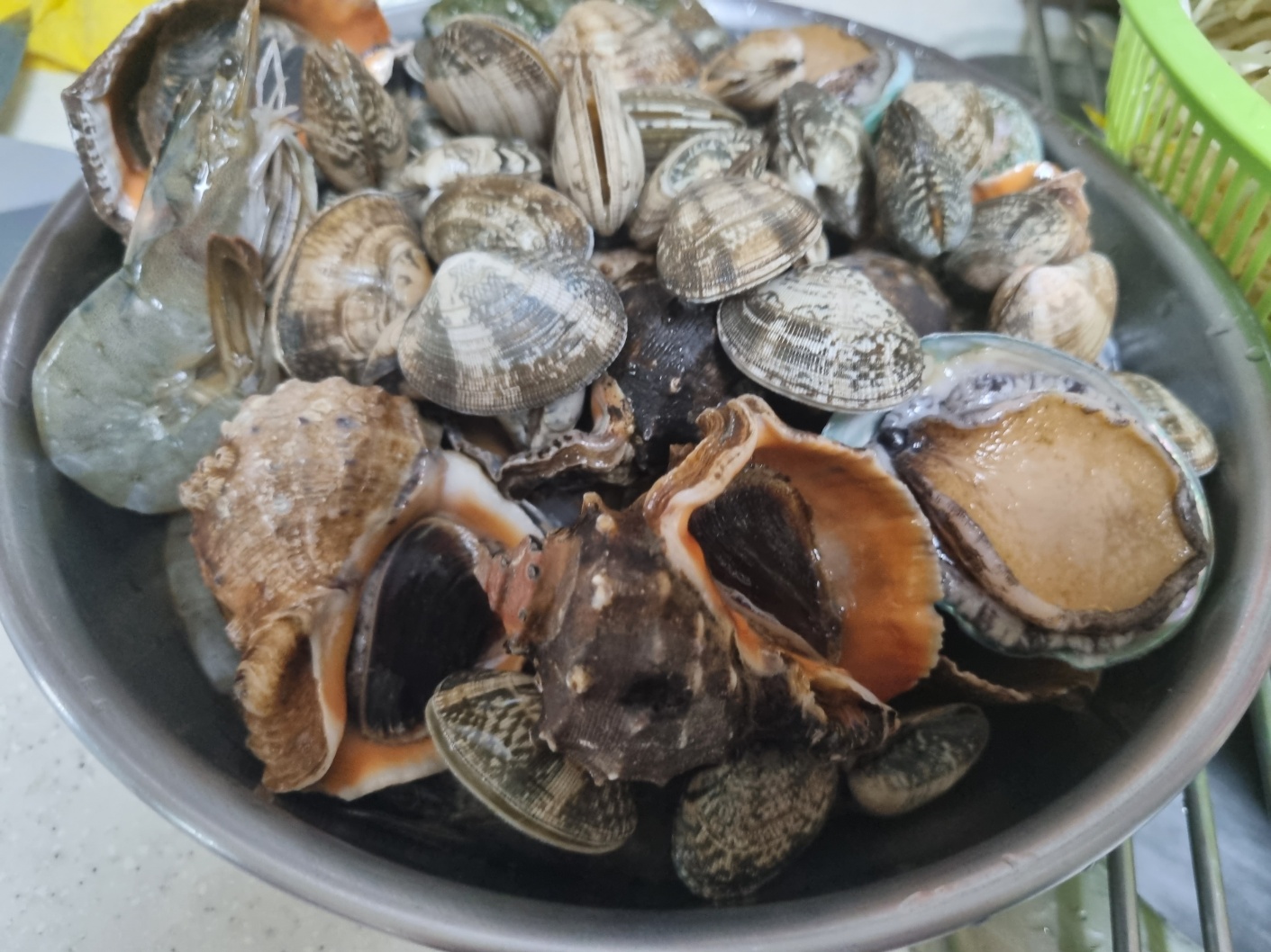마트에 갔어요. 원래 새우만 사려고 했어요. 하지만 생각보다 해산물이 저렴했어요. 새우 30마리 만원. 소라 1kg 만원. 전복 5마리 만원. 바지락은 육수용으로 냉동실에서 꺼냈어요. 깨끗이 씻었어요. 소라가 1kg에 무려 10 마리에요.